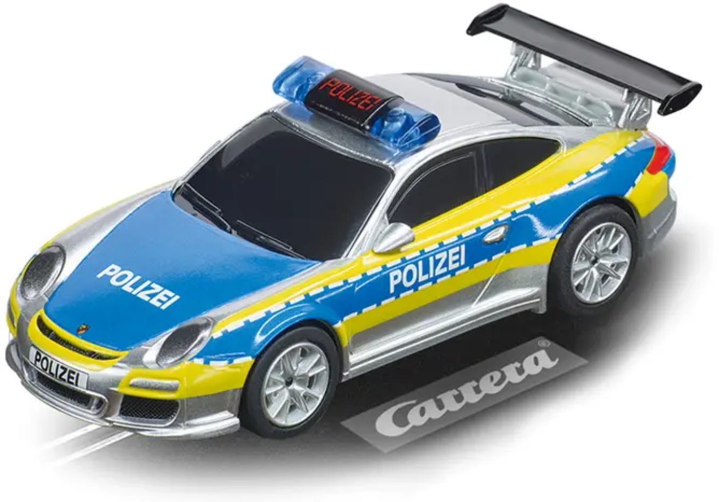Die hochwertige Lackierung mit neongelben Highlights und der markante Heckspoiler machen das Fahrzeug zum Highlight. Am Handregler ist dein Fingerspitzengefühl voll gefordert, um den Porsche sicher durch die Kurven zu steuern. Kompatibel mit allen Carrera GO!!! und GO!!! Plus Bahnen – perfekt für kleine Gesetzeshüter:innen und Rennsport-Fans!