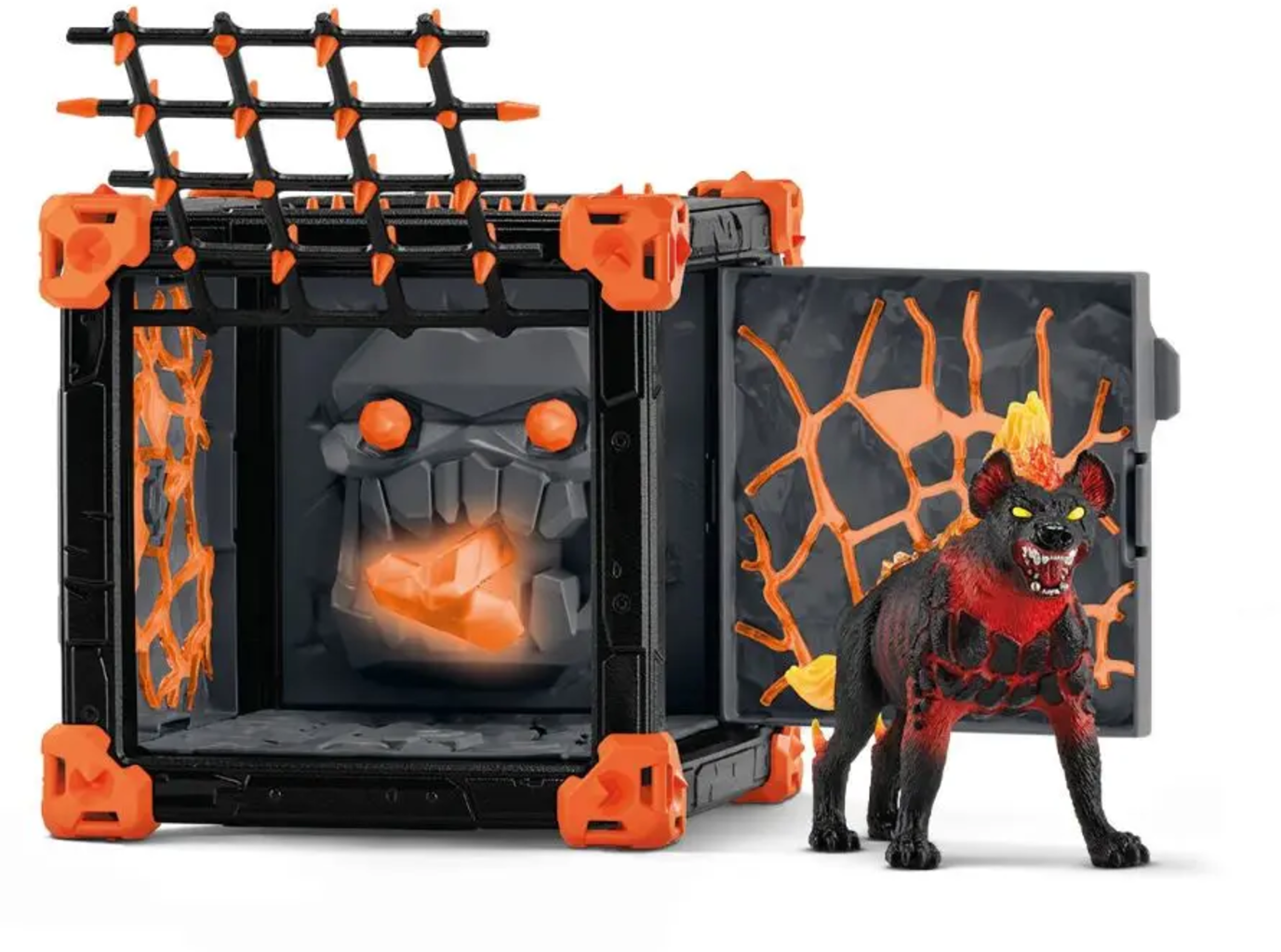Die Lavahyäne bewacht ihren BattleCave mit glühenden Augen und lodernder Mähne. Aus den Augen des Gruselgesichts schießen Pfeile auf Eindringlinge, und wer die Gitterstäbe berührt, wird in eine tückische Falle gelockt. Nur wer klug und vorsichtig vorgeht, kann sich dem Weltenkristall nähern – ein spannendes Abenteuer voller Action für alle ELDRADOR® Fans!