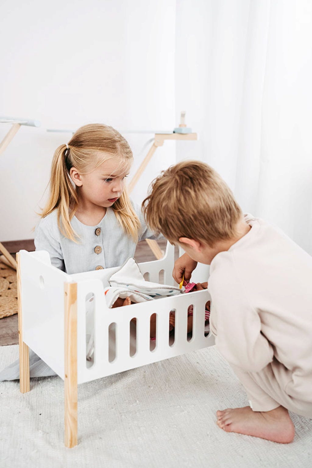 Dieses Puppengitterbett „Little Button“ lädt Kinder zu liebevollen Spielmomenten ein. Dank ergonomischer Höhe, weicher Bettwäsche und stabiler Verarbeitung können die Puppen sicher schlafen. Das stilvolle skandinavische Design macht das Bettchen zu einem echten Hingucker im Puppenzimmer.