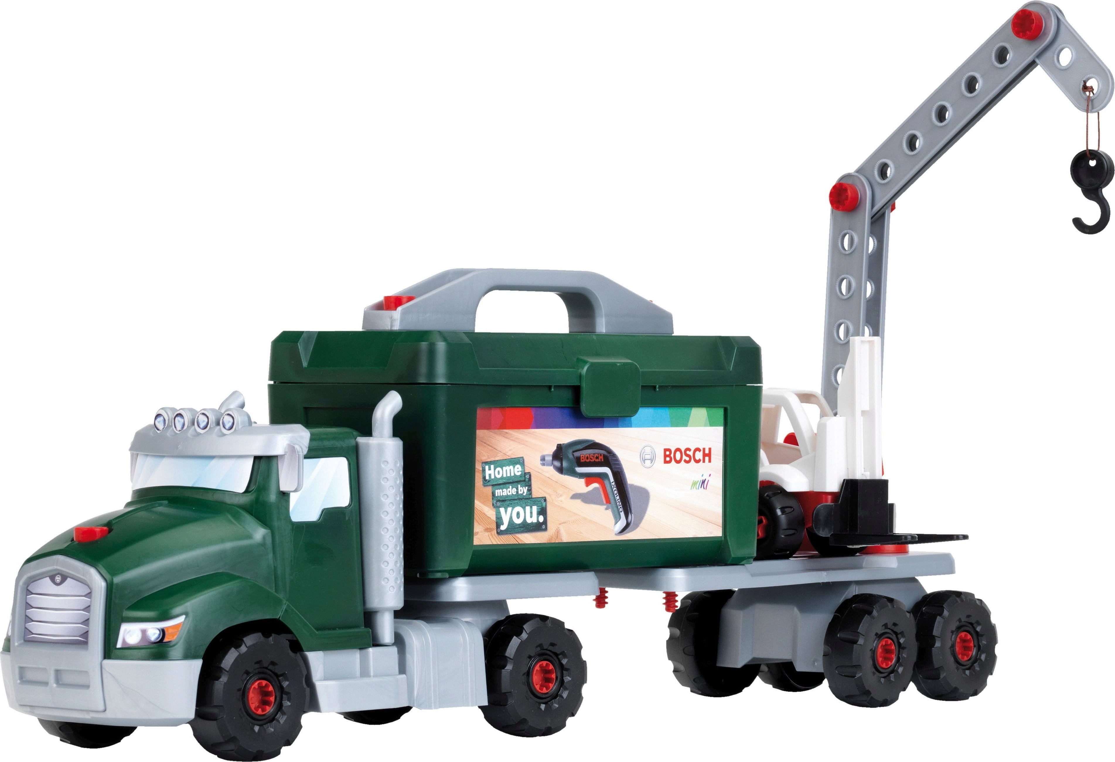Inhalt: Schraubtruck, Werkzeug-Box, Auflieger, Kran, Akkuschrauber, Gabelstapler mit Palette, 2 Faltschachteln und weiteres Zubehör.