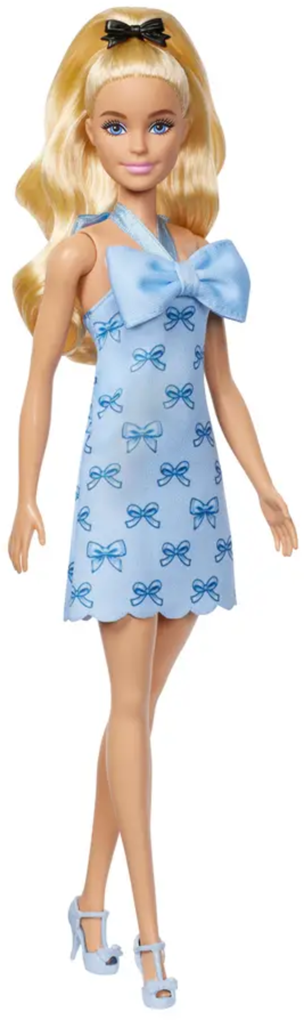 - Des talons bleus assortis et un nœud noir dans les cheveux