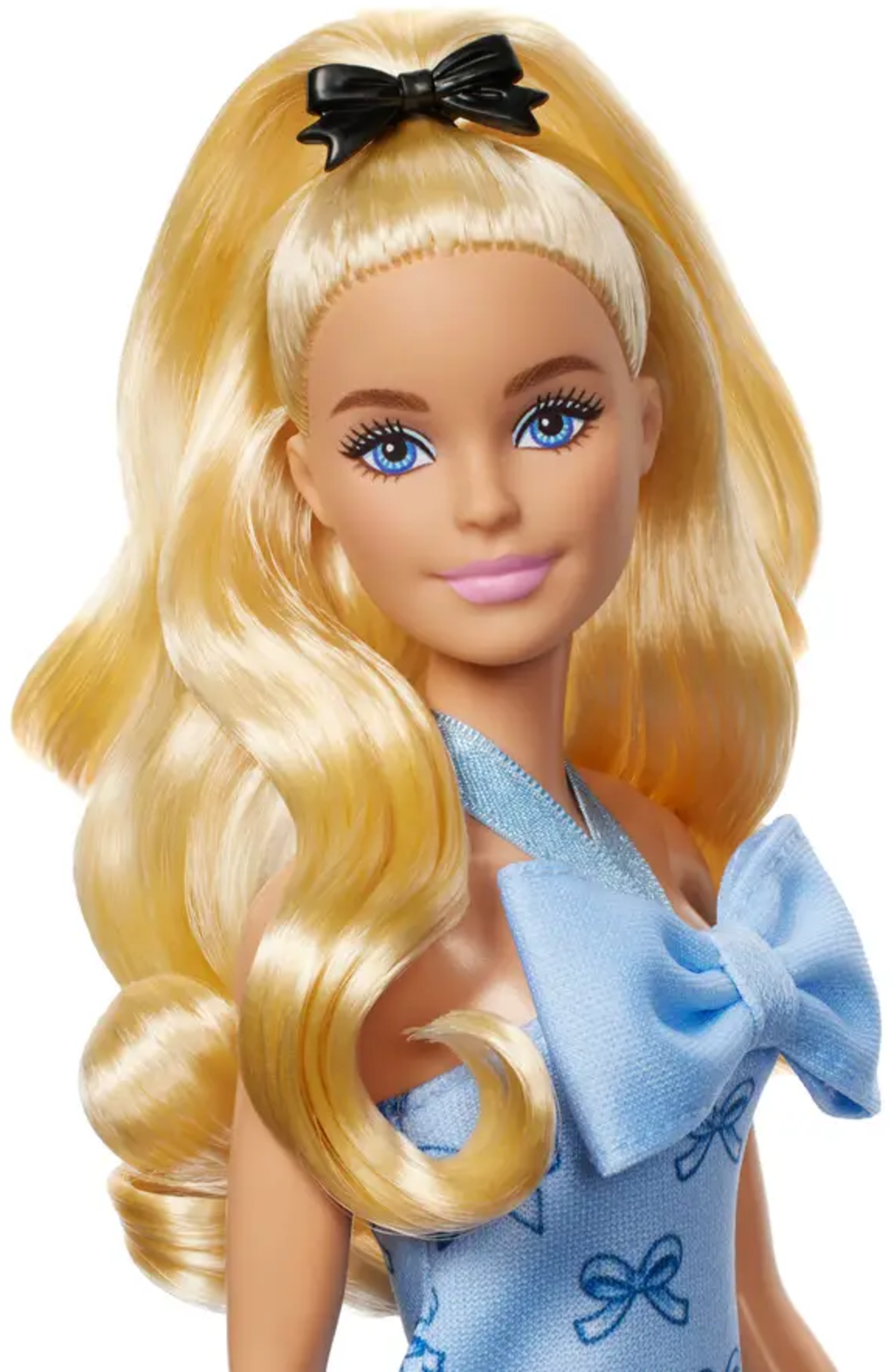 - Une poupée Barbie qui porte ses cheveux blonds coiffés en une queue de cheval souple