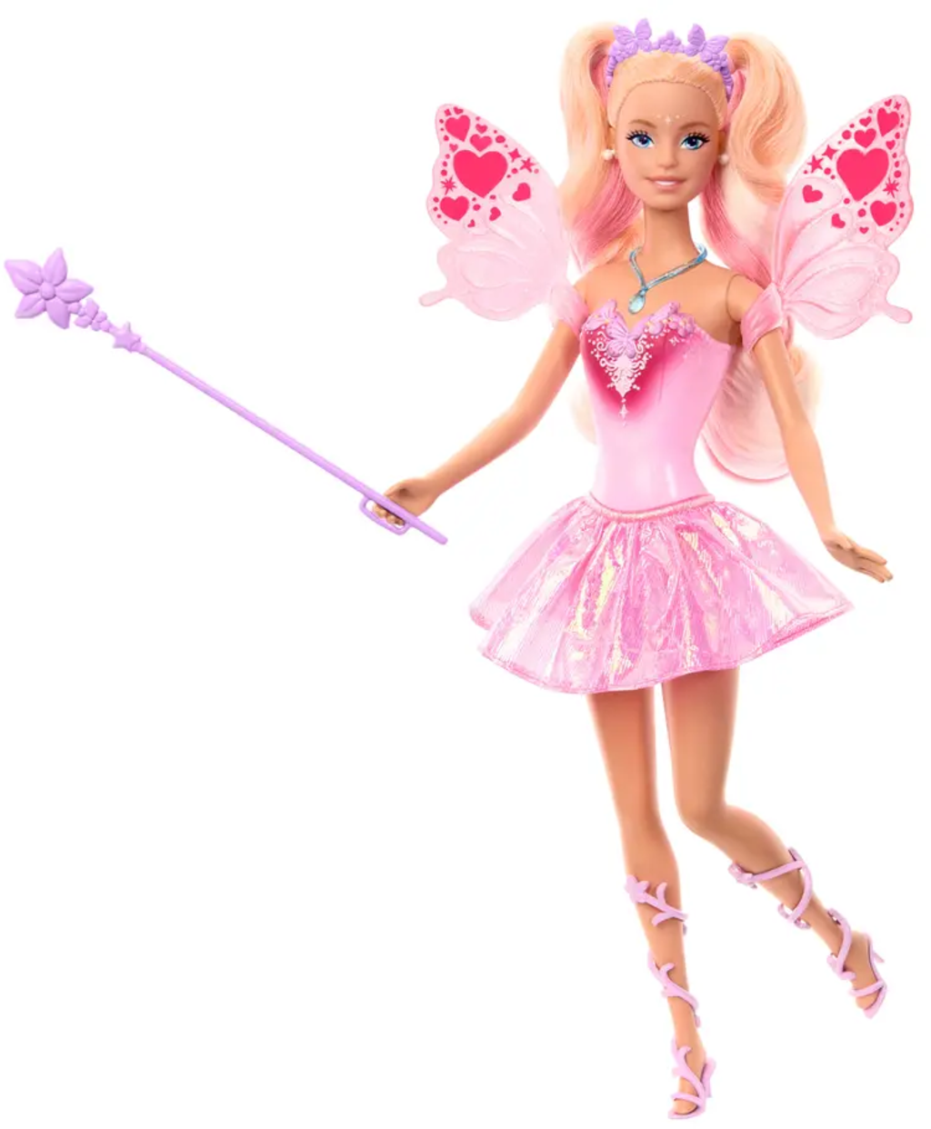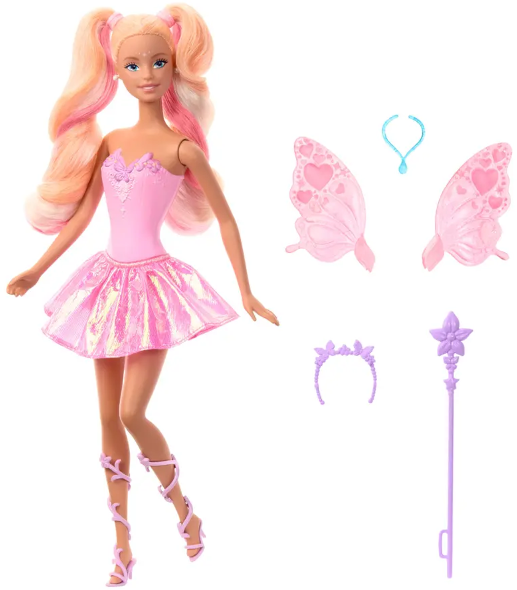 - Une poupée Barbie Fée avec sa robe scintillante, ses talons à lanières, son serre-tête papillon et son collier en forme de goutte d’eau