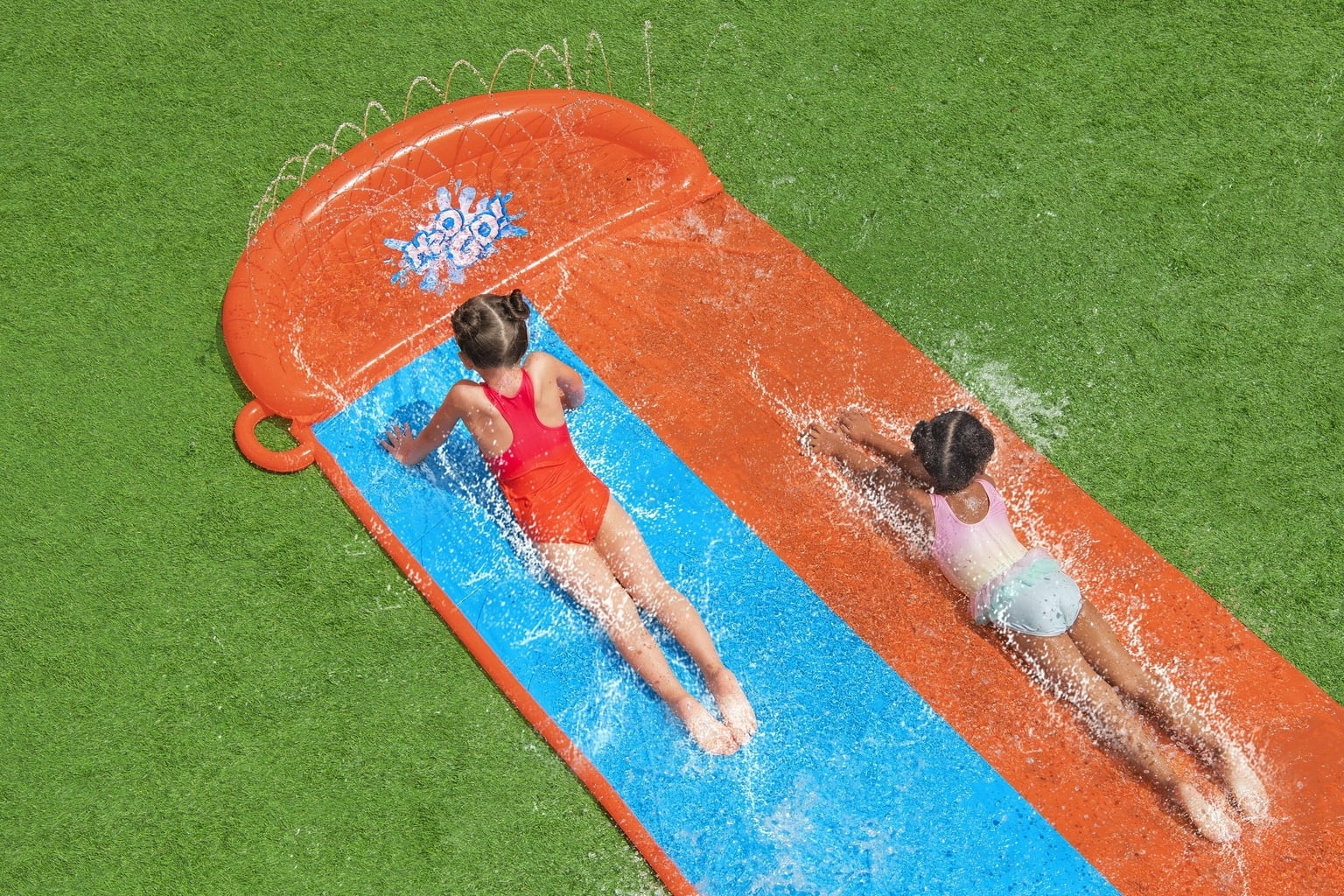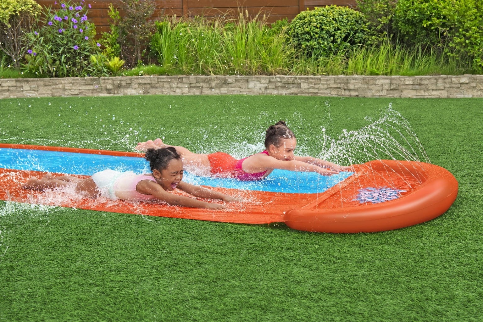 Envie de sensations fortes et de fraîcheur ? Avec le H2OGO!® Toboggan Aquatique 2 Personnes, profitez d’un maximum de plaisir directement dans votre jardin. Équipé de deux pistes, il permet d’organiser des courses palpitantes. Avec près de cinq mètres de longueur, il offre tout l’espace nécessaire pour des descentes rapides et excitantes !