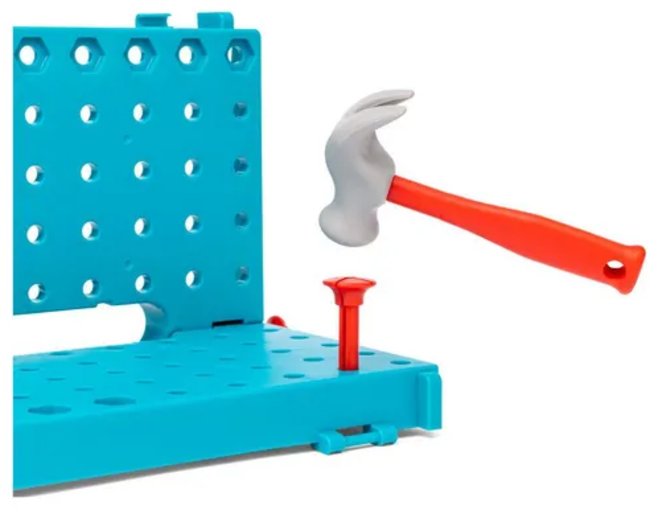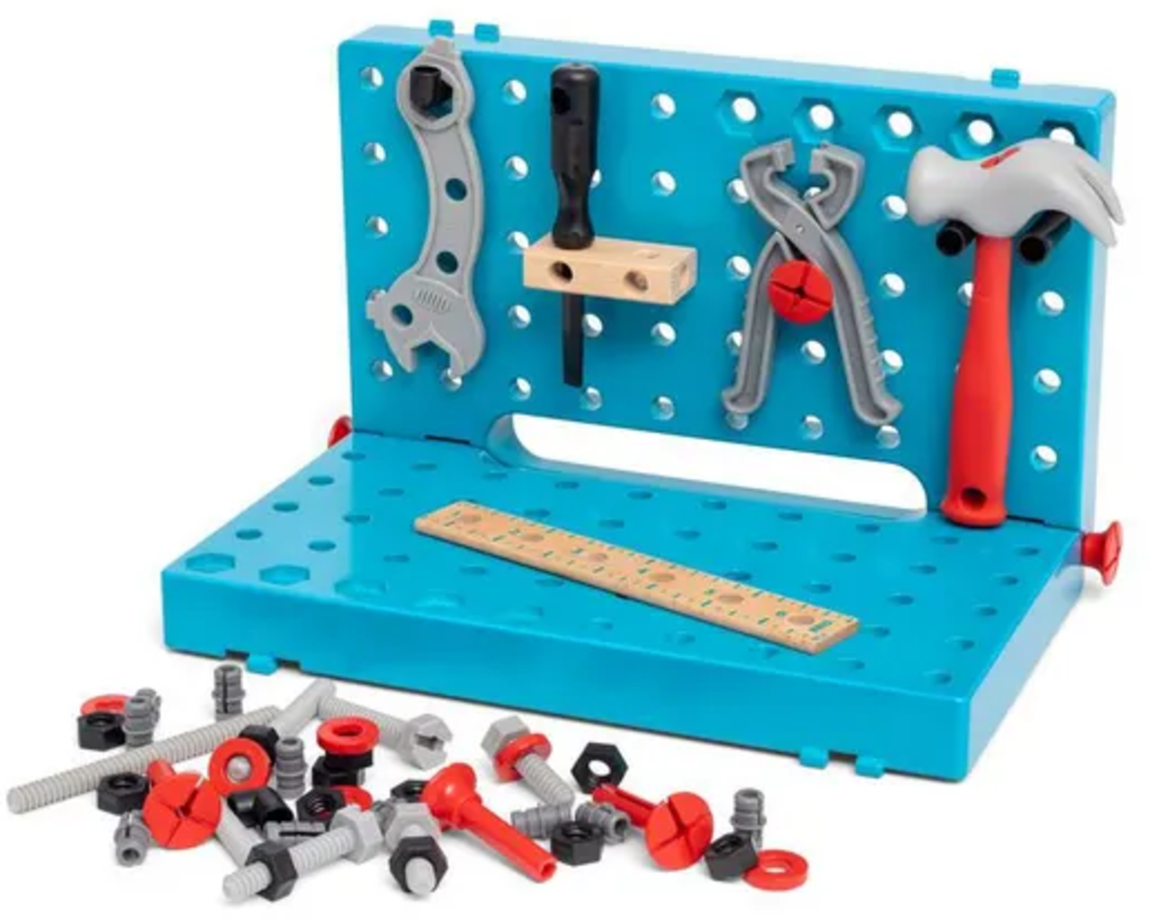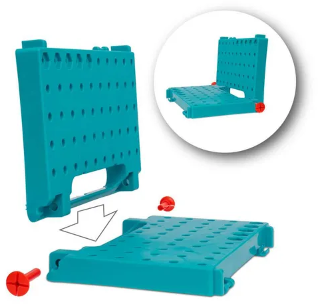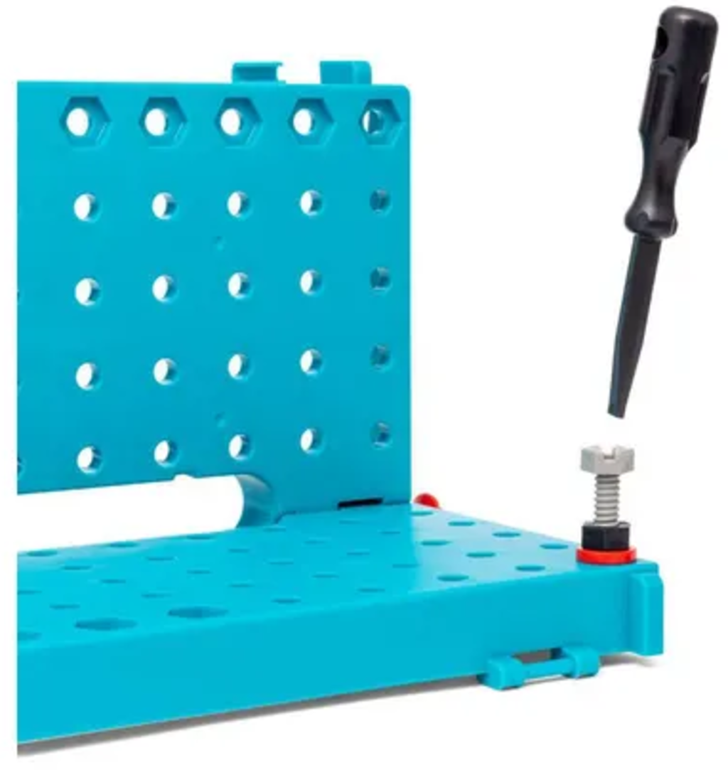 Apprenez de manière ludique à manipuler le marteau, la clé à molette, le tournevis, la pince et la règle. La mallette sert à la fois de lieu de rangement et d'établi.