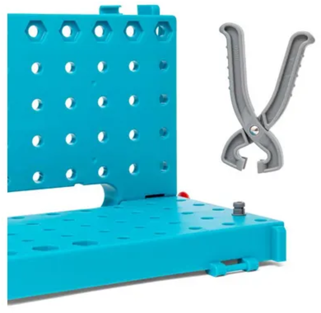 Contenu : Mallette Établi, marteau, clé à molette, tournevis, pince, règle, nombreuses vis ainsi que des éléments de connexion et de construction