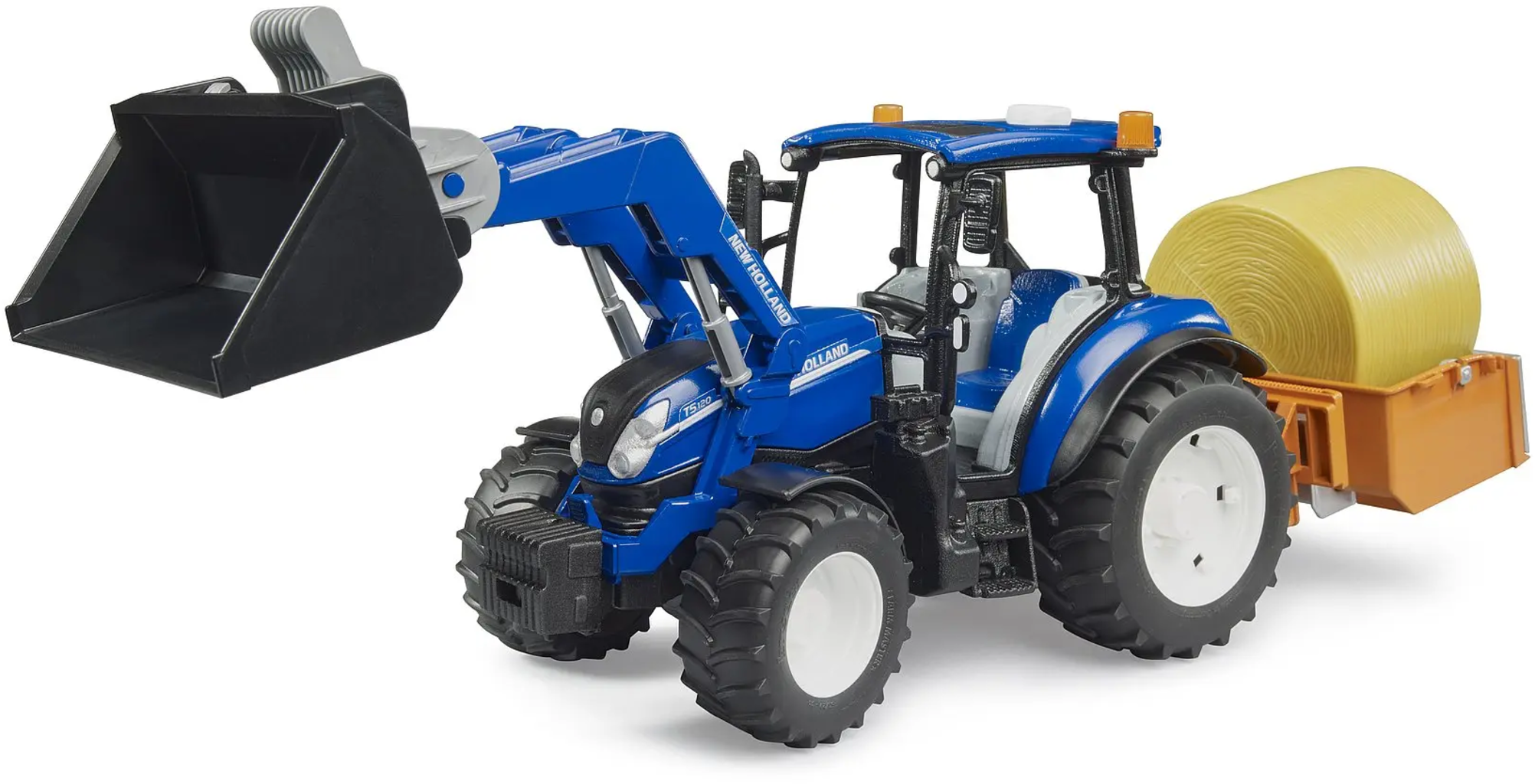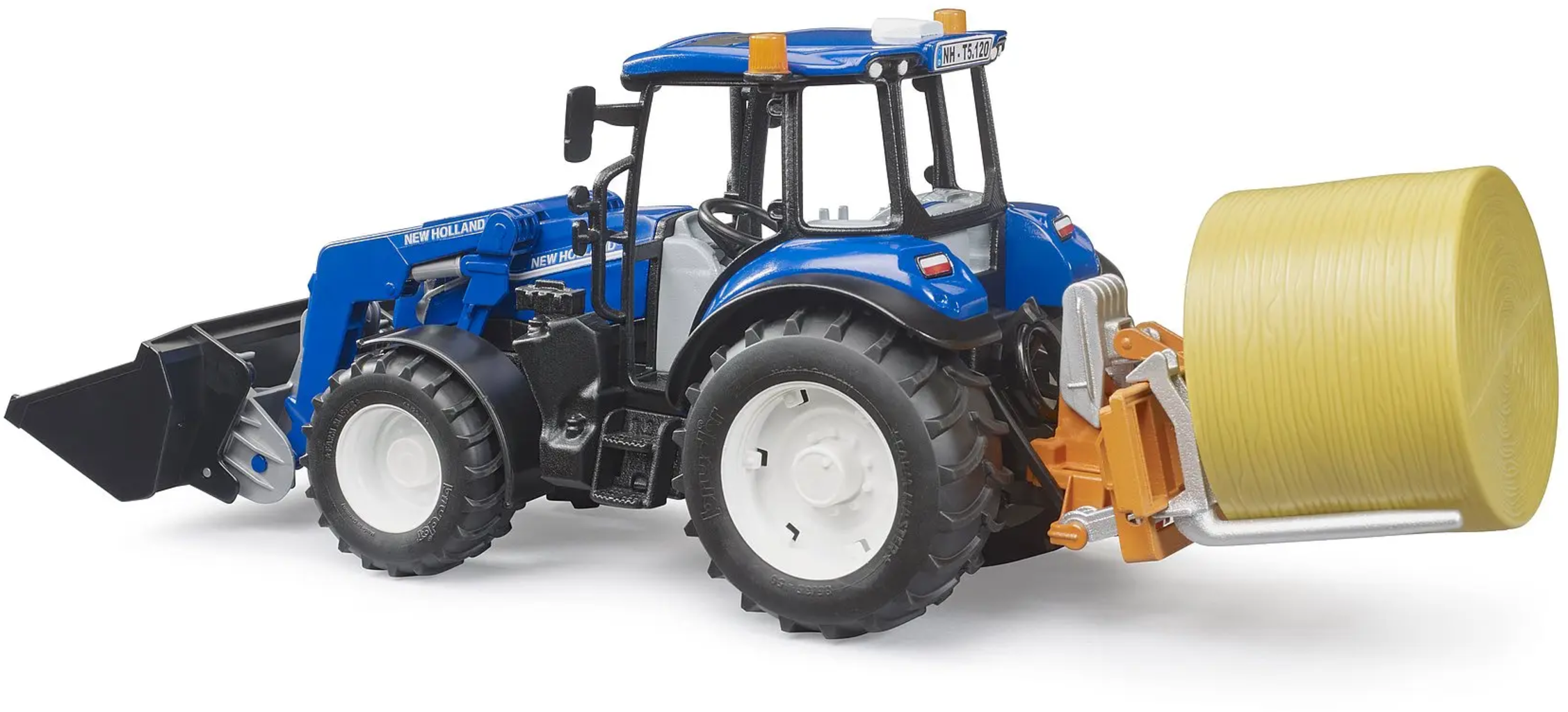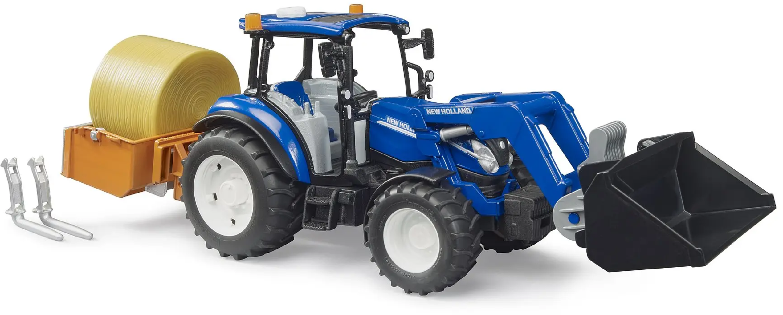 Bruder New Holland T5.120 avec chargeur frontal, caisse de chargement, fourches et balles rondes