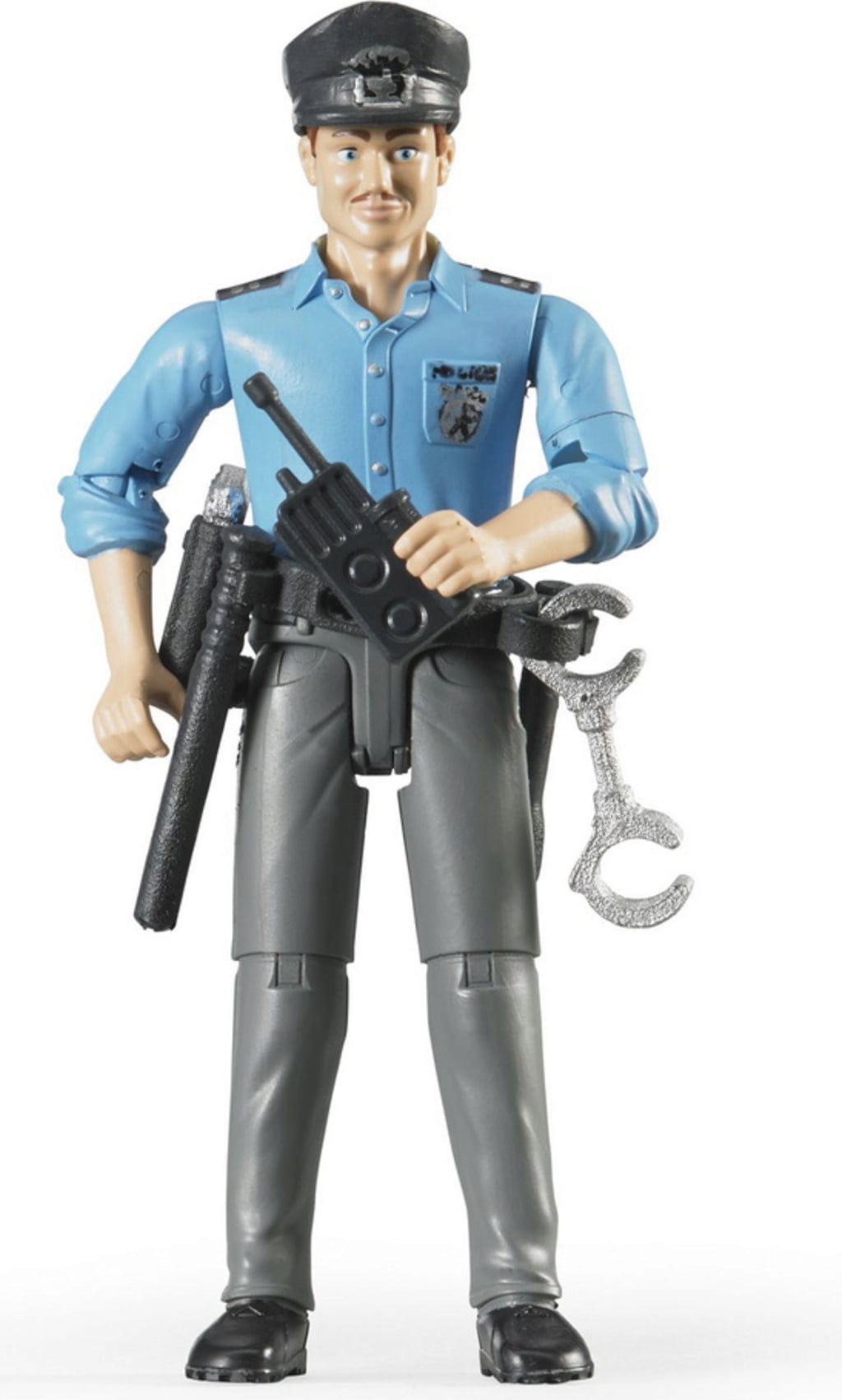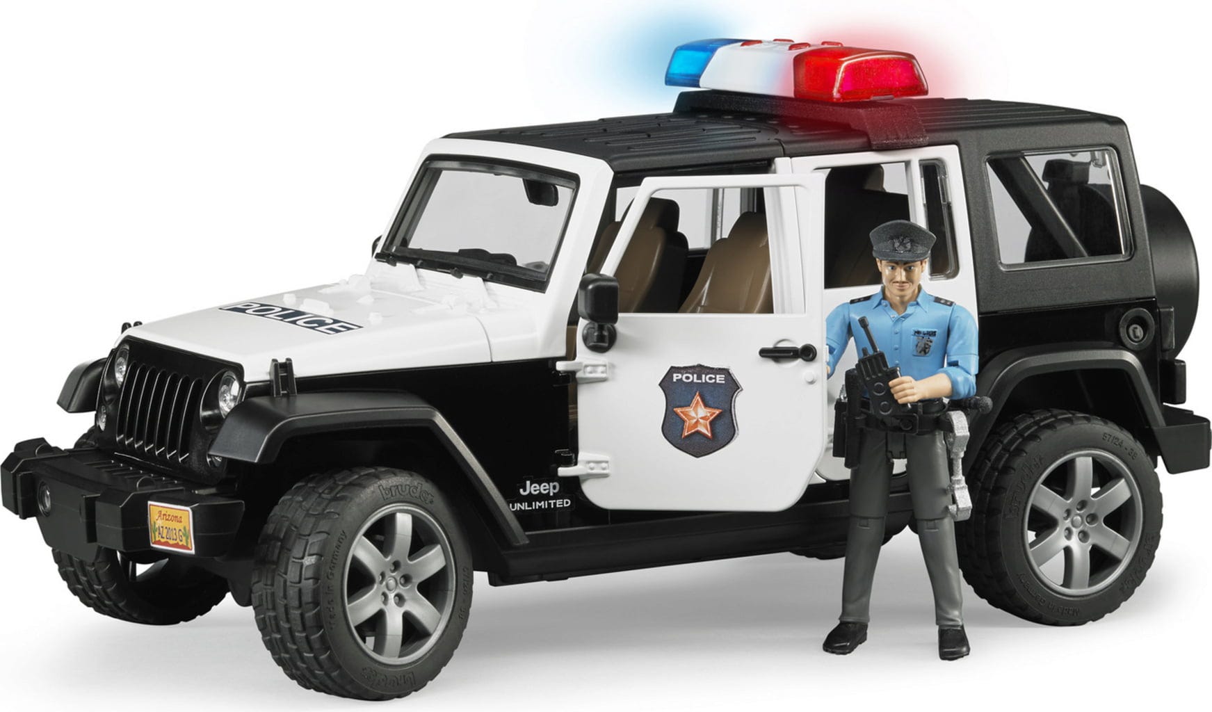 Des éléments d'extension supplémentaires, comme un treuil (non inclus), peuvent être fixés à l'avant, et l'attelage amovible offre également diverses possibilités. Un point fort particulier est le module moderne Light & Sound, qui émet trois signaux d'avertissement différents et un bruit de moteur. Le policier est parfaitement équipé pour chaque mission avec une radio, une matraque et une lampe de poche.