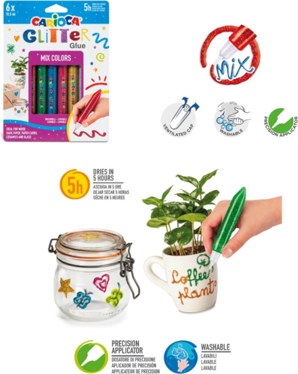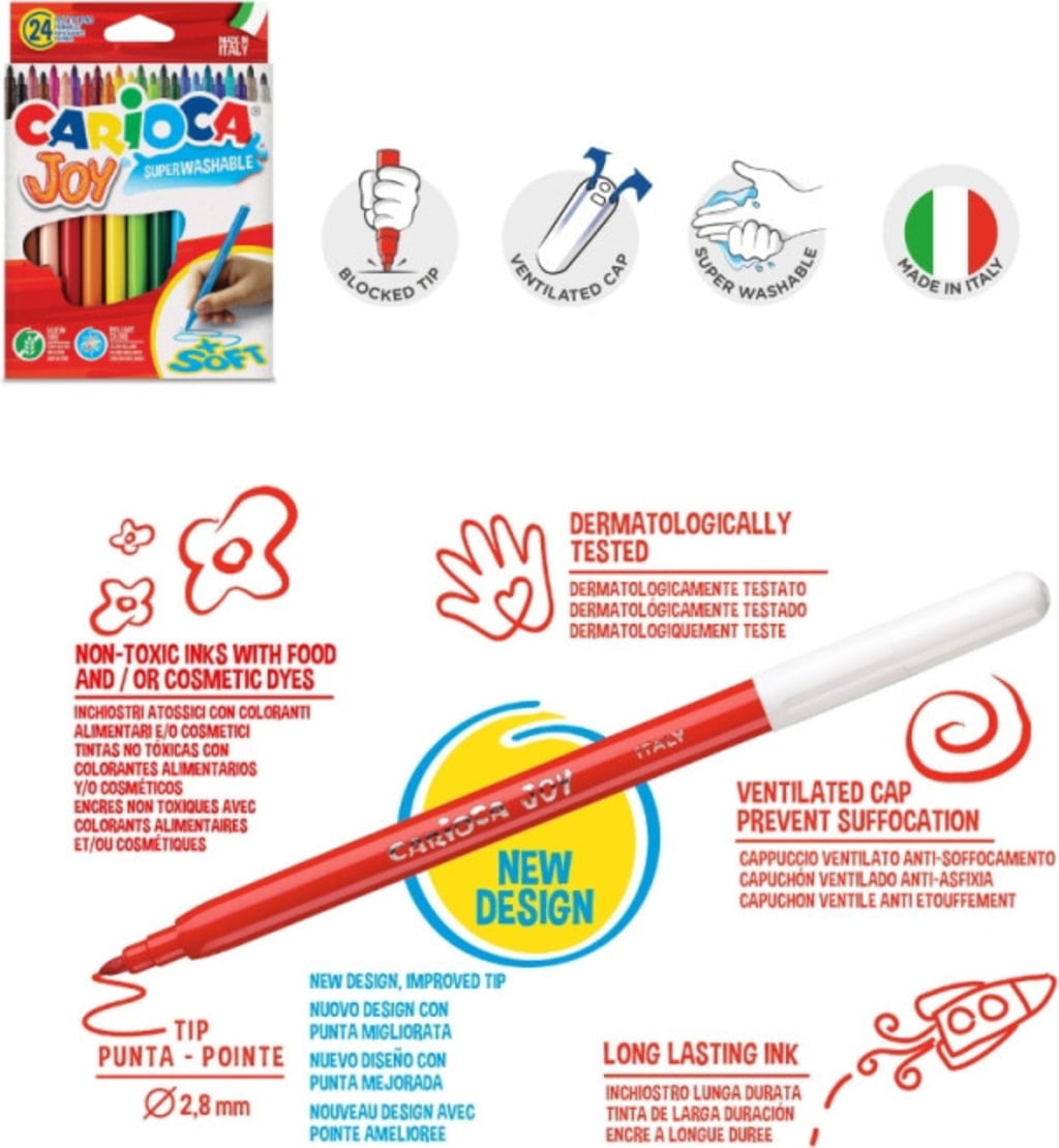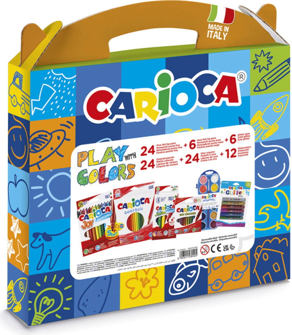 Contenu : 24 crayons de couleur, 6 marqueurs Jumbo Maxi, 24 feutres Joy à pointe fine, 24 craies grasses, 12 couleurs aquarelle, 6 stylos colle pailletée
