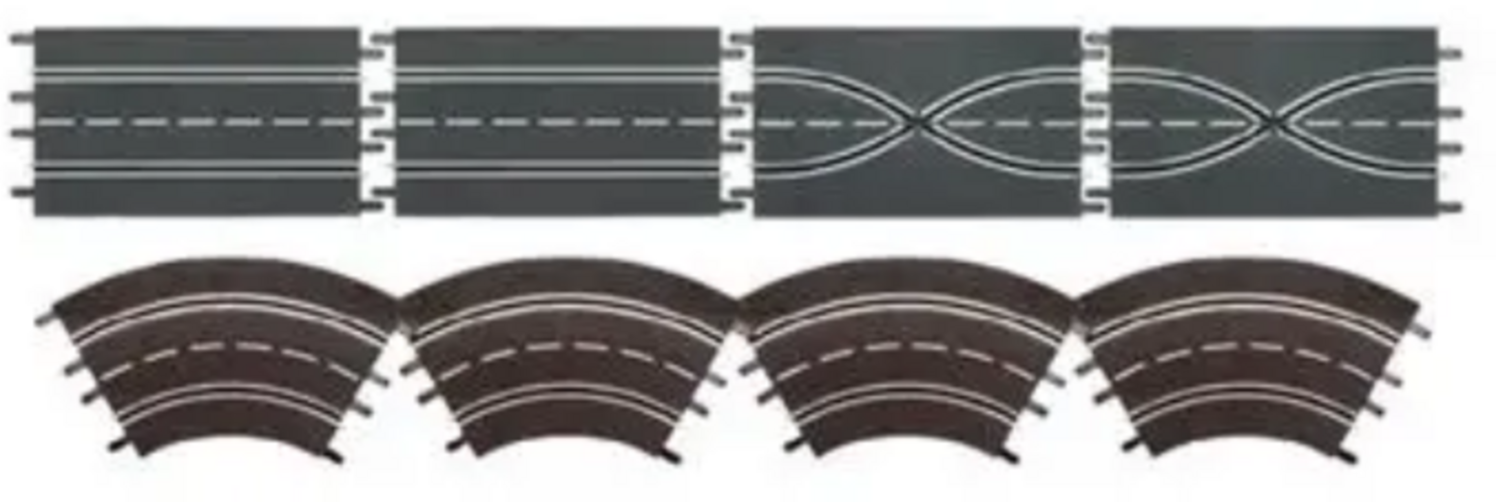Deux lignes droites standard, deux pièces de changement de voie et quatre virages à 60°. Comprend également des dispositifs de verrouillage des éléments de circuit.