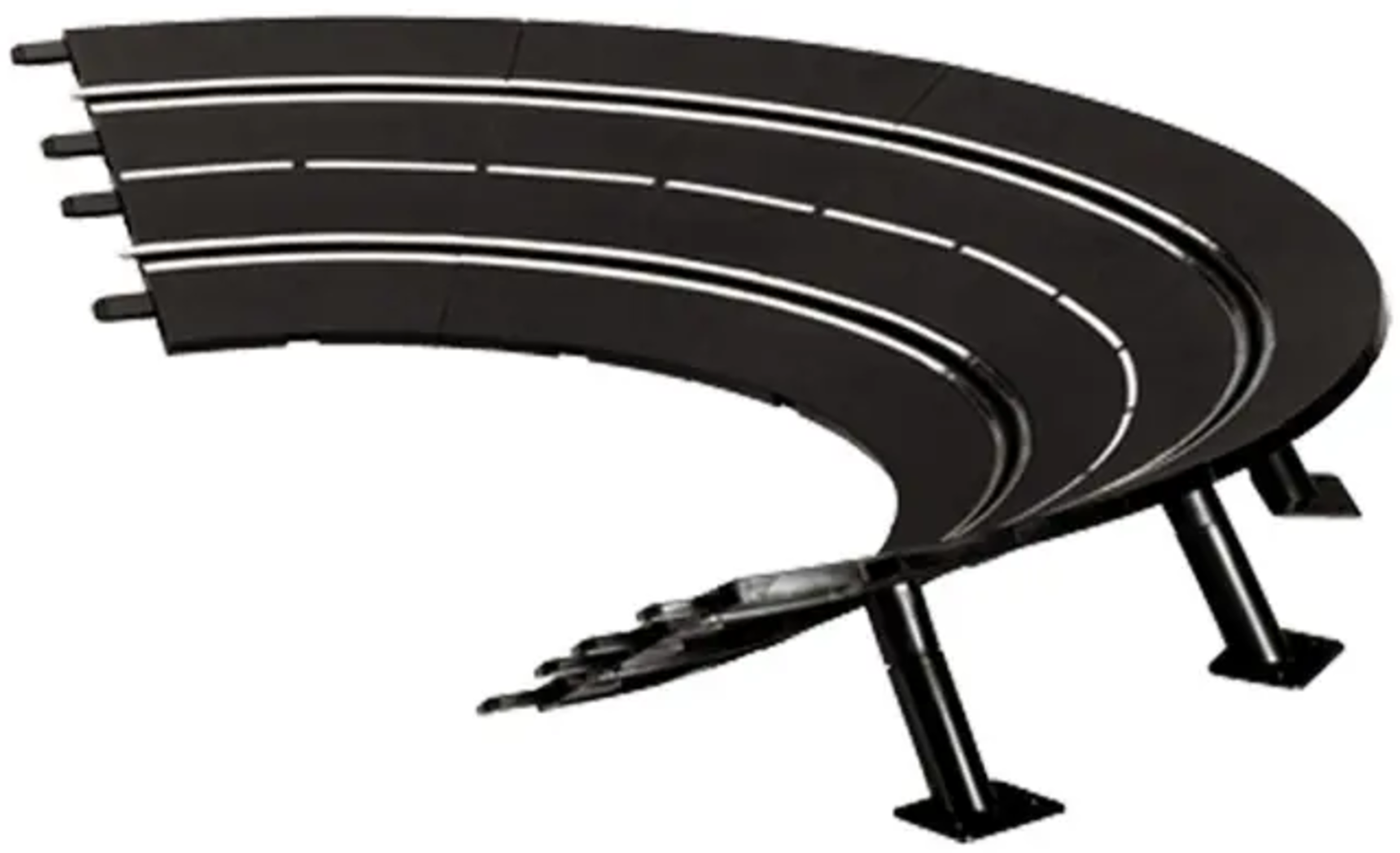 Avec ce virage relevé, vous ajoutez encore plus d'action et de suspense à vos courses ! Composé de six éléments de rail de 30° chacun et des supports adaptés, il forme un virage impressionnant à 180°. Ici, la bonne vitesse est essentielle : trop lent, vous perdez l’élan ; trop rapide, la force centrifuge devient un défi !