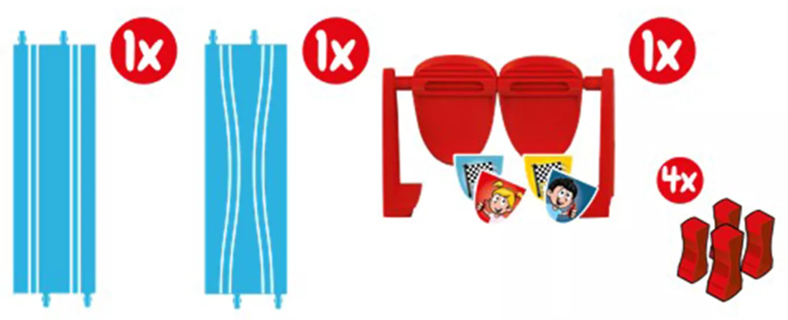 Plus de variété pour les jeunes pilotes ! Deux lignes droites différentes, des éléments basculants rigolos et quatre supports élèvent votre circuit à un tout autre niveau. Conçu spécialement pour les enfants dès 3 ans.