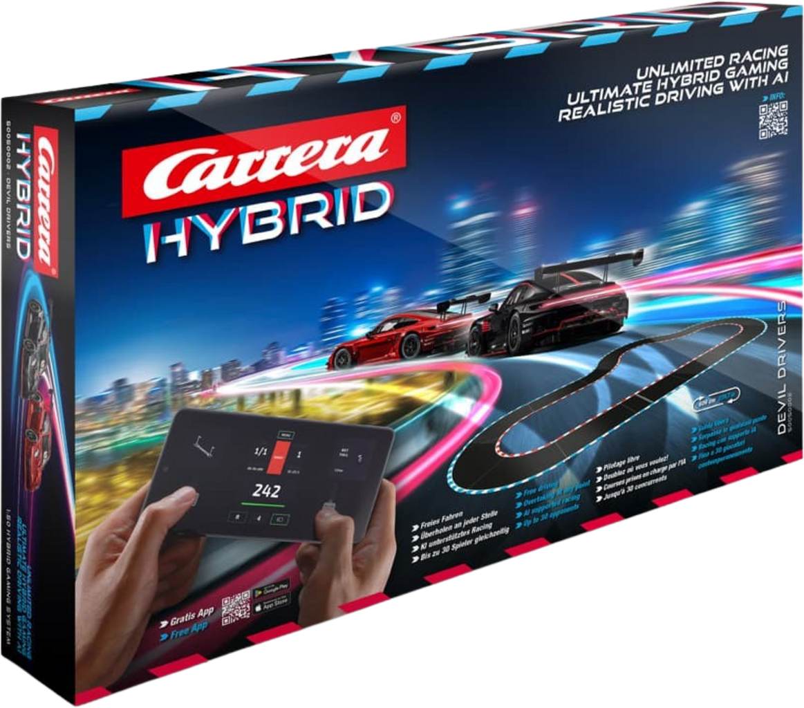 Bienvenue dans le futur ! Avec le kit de démarrage HYBRID - Devil Drivers, tu ne conquiers pas seulement le circuit, mais tu peux aussi mettre les gaz en dehors de la piste. Les deux véhicules fonctionnant sur batterie peuvent être pilotés avec un smartphone ou une tablette grâce à une application gratuite. De plus, l'appli permet de nombreux réglages individuels des véhicules.
