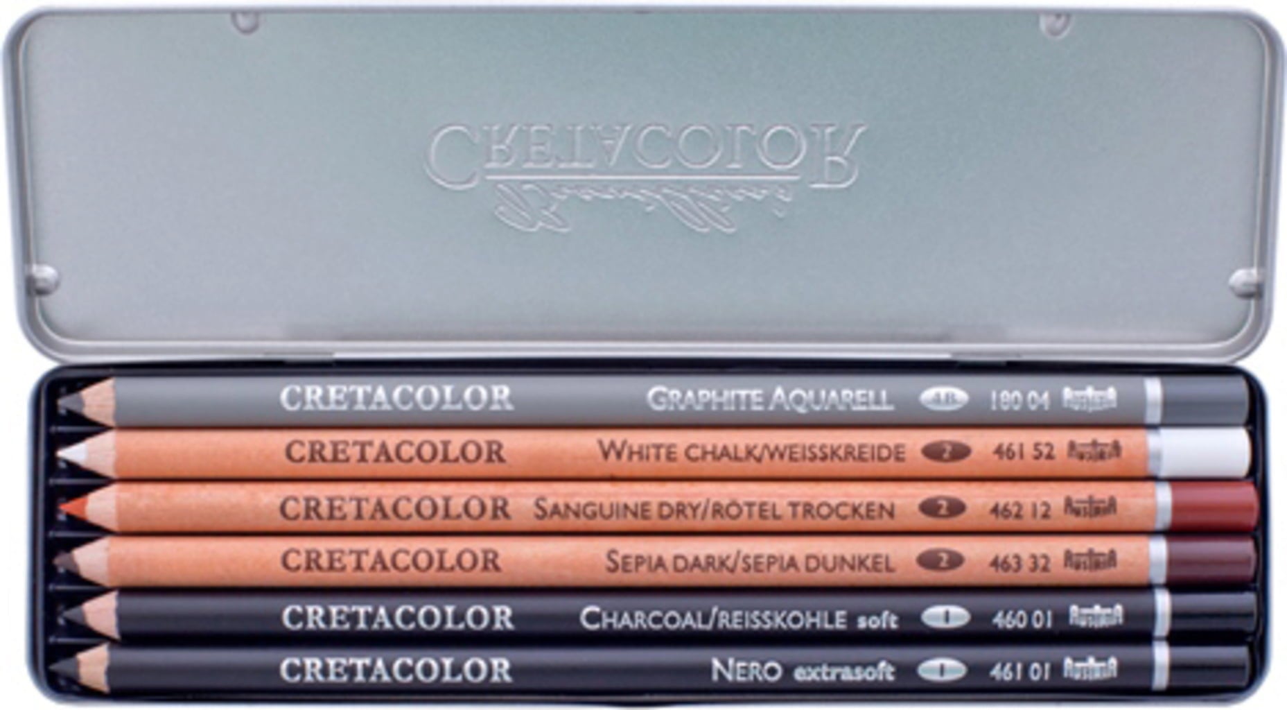 Sanguine, sépia, craie blanche, fusain, Nero, graphite aquarellable 4B