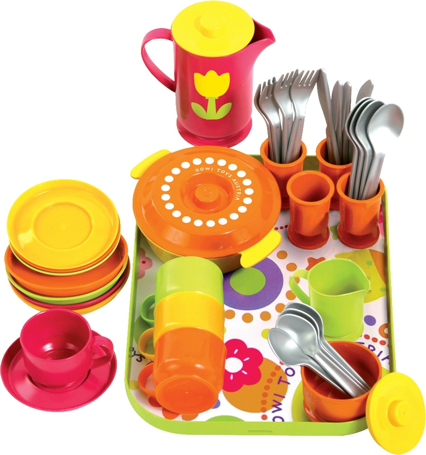 Contenu : plateau, tasses, soucoupes, fourchettes, couteaux, cuillères, théière, pichet, casserole et sucrier.