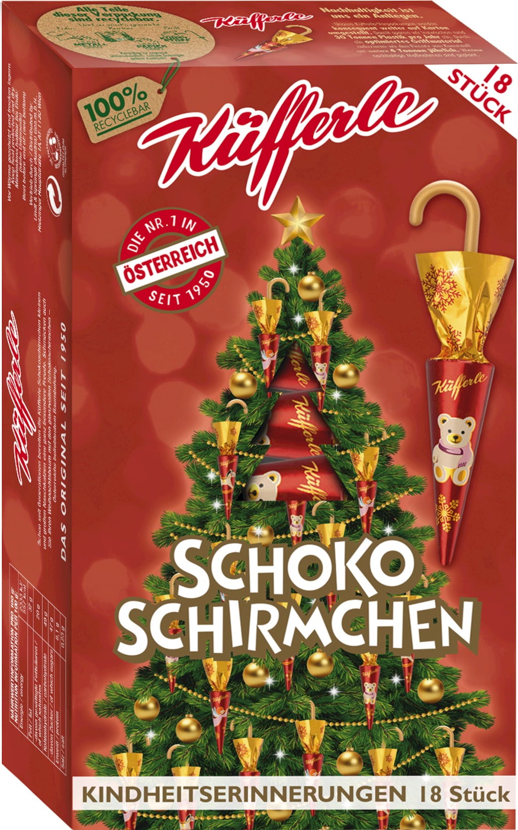 Les Parapluies en chocolat de Küfferle font partie des décorations traditionnelles du sapin de Noel autrichien et font le bonheur des petits et des grands ! Découvrez sans plus attendre ces friandises au chocolat au lait fondant avec des noisettes finement moulues, dans leur emballage irrésistible avec d'adorables motifs de notre enfance !