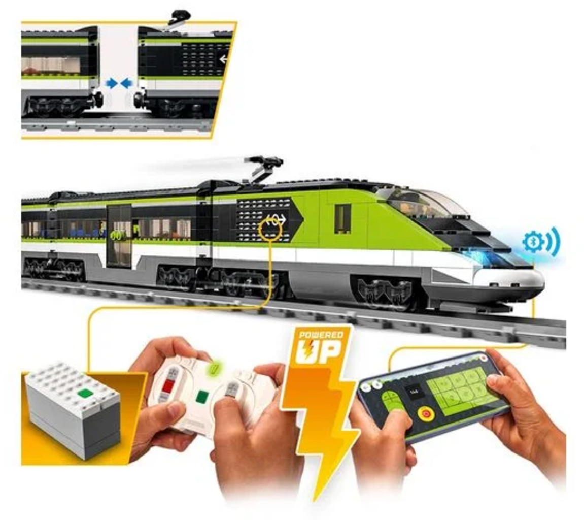 - La locomotive à grande vitesse et ses phares à intensité variable peuvent être contrôlés avec la télécommande incluse ou avec un appareil connecté équipé de l’appli LEGO® Powered Up