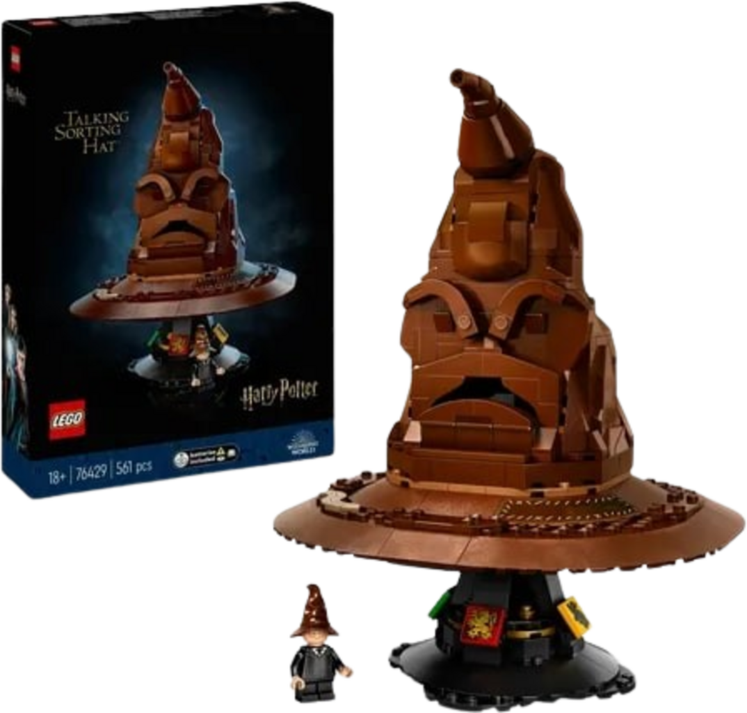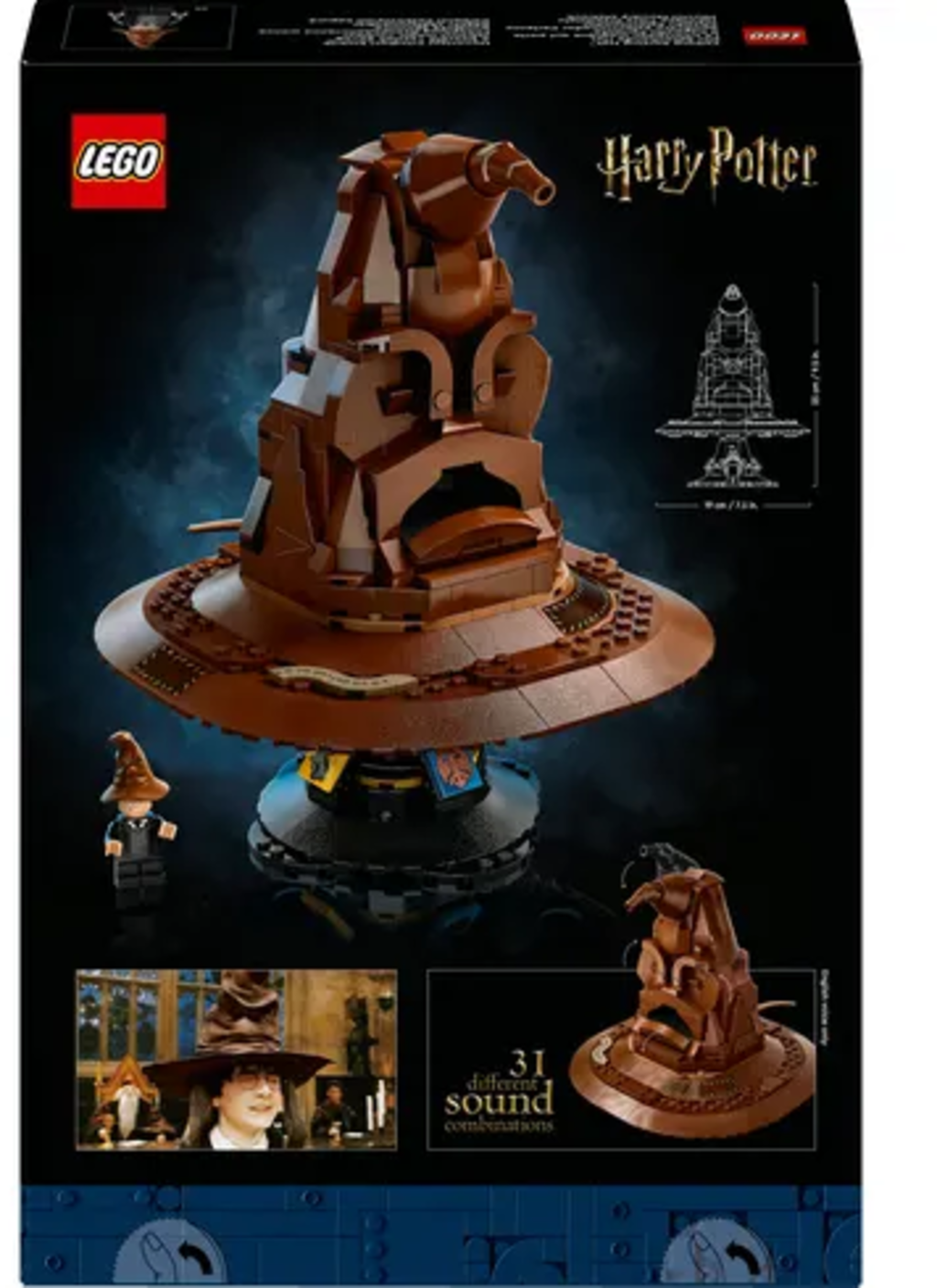 Le Choixpeau en briques LEGO est équipé d’une brique de sons aléatoires qui lui donne une voix. Inclinez le haut du chapeau ou placez-le sur votre tête pour l'activer et découvrir votre maison de Poudlard : il peut même parfois chanter sa chanson. Son présentoir décoré des blasons des quatre maisons constitue un superbe socle d’exposition.