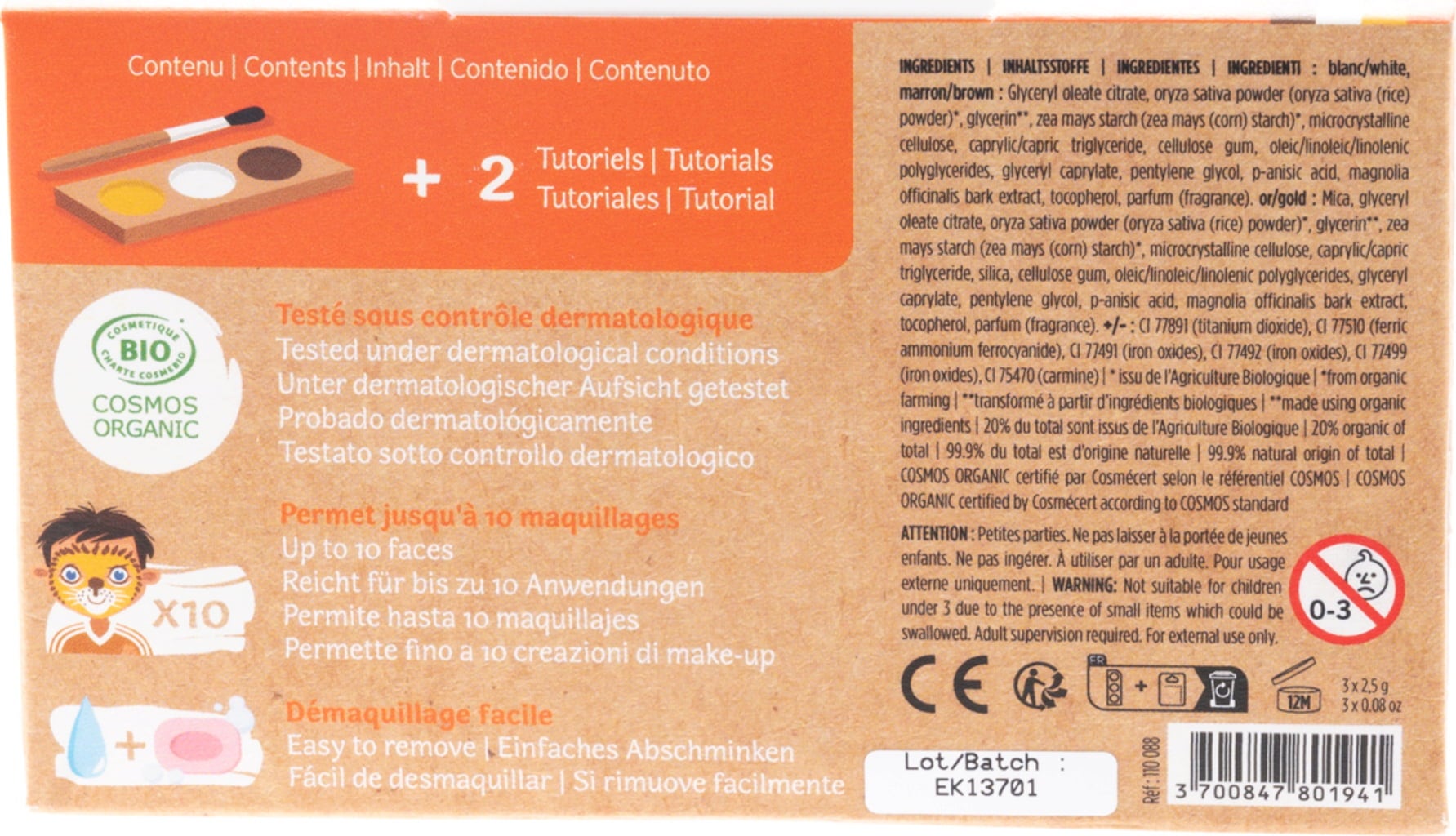 • Est un kit de maquillage aux formulations naturelles, hypoallergéniques et douces pour la peau.