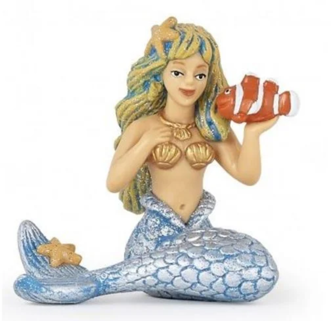 Plonge dans le monde sous-marin des sirènes et vis des aventures passionnantes. Cette sirène à la magnifique queue argentée est accompagnée de son ami le poisson-clown.