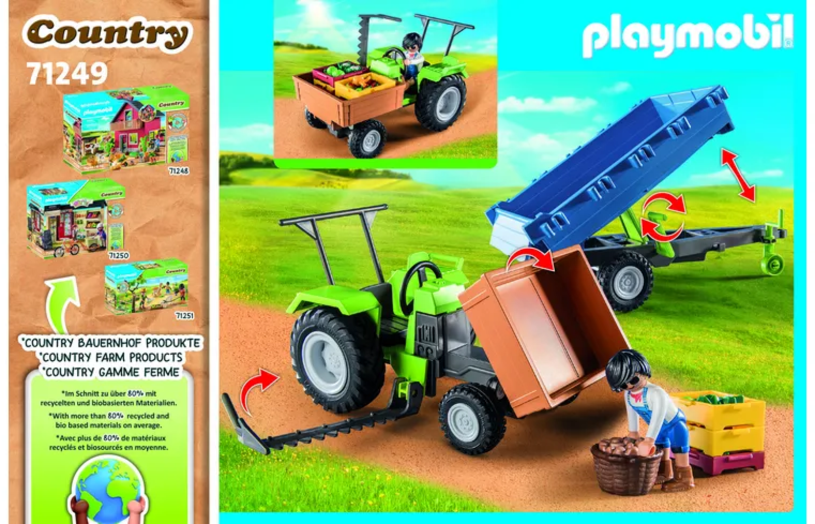 - Accessoires : 1 tracteur avec sa remorque, 4 tétra-packs, 3 pommes, 2 salades, 1 poivron, 1 concombre, 5 boîtes de transport, 1 fourche, 2 choux-fleurs, 2 pains, 1 œuf, 1 ail, 1 carotte, 1 panier, 1 corbeille de pommes de terre