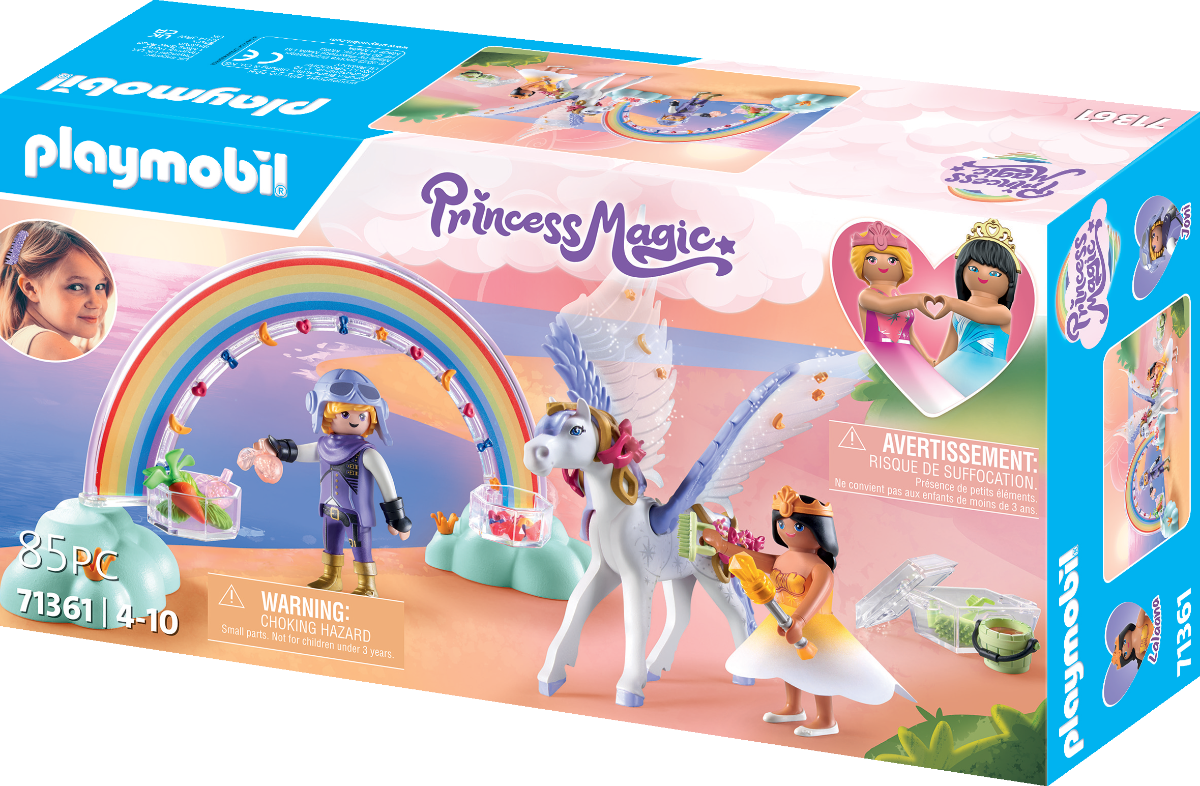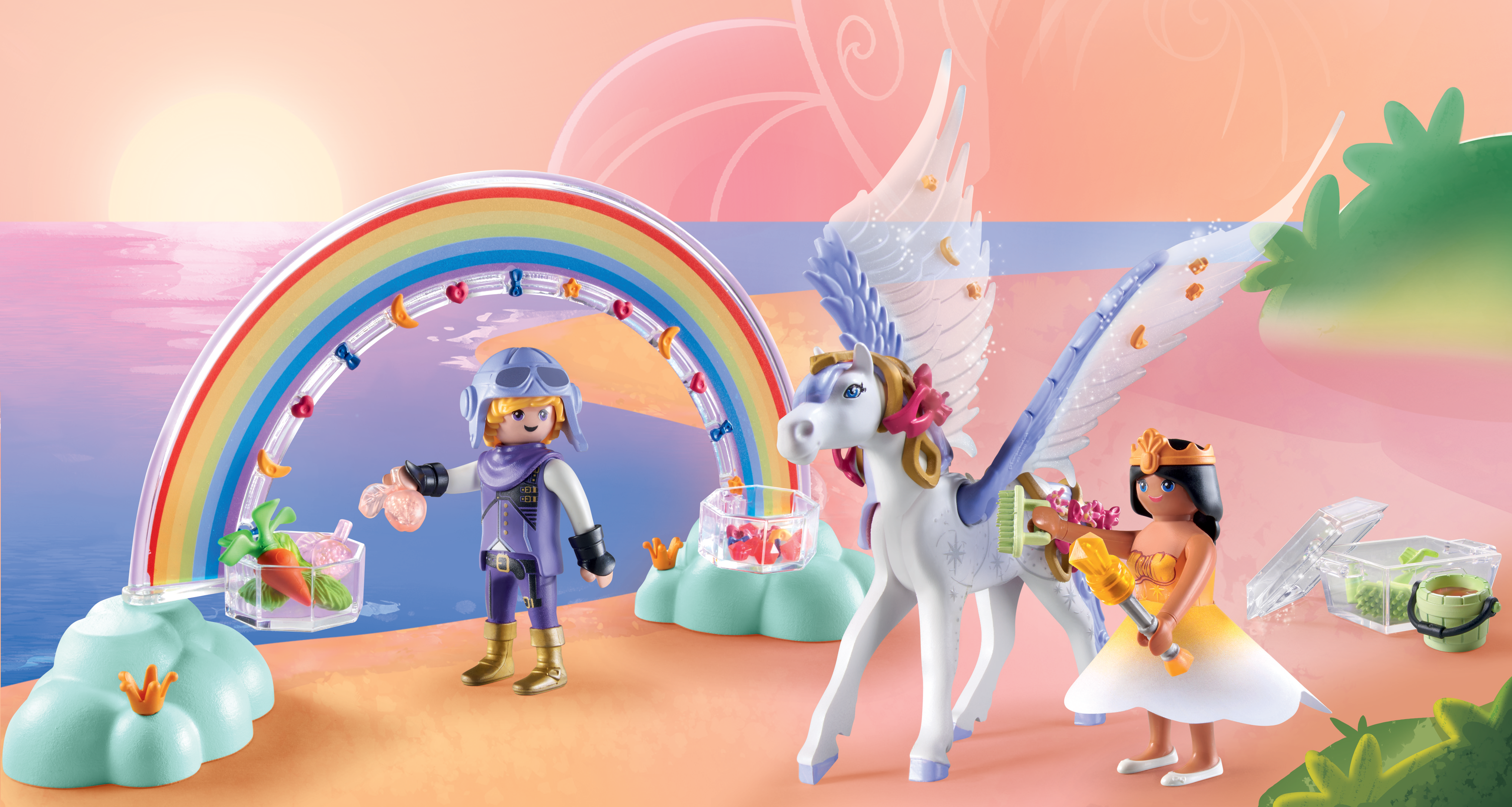 • Le coffret comprend une princesse, un chevalier, un un pégase (cheval ailé), une véritable brosse, un arc-en-ciel magique avec boîtes de rangements, un coffre transparent et de nombreux accessoires de décoration.