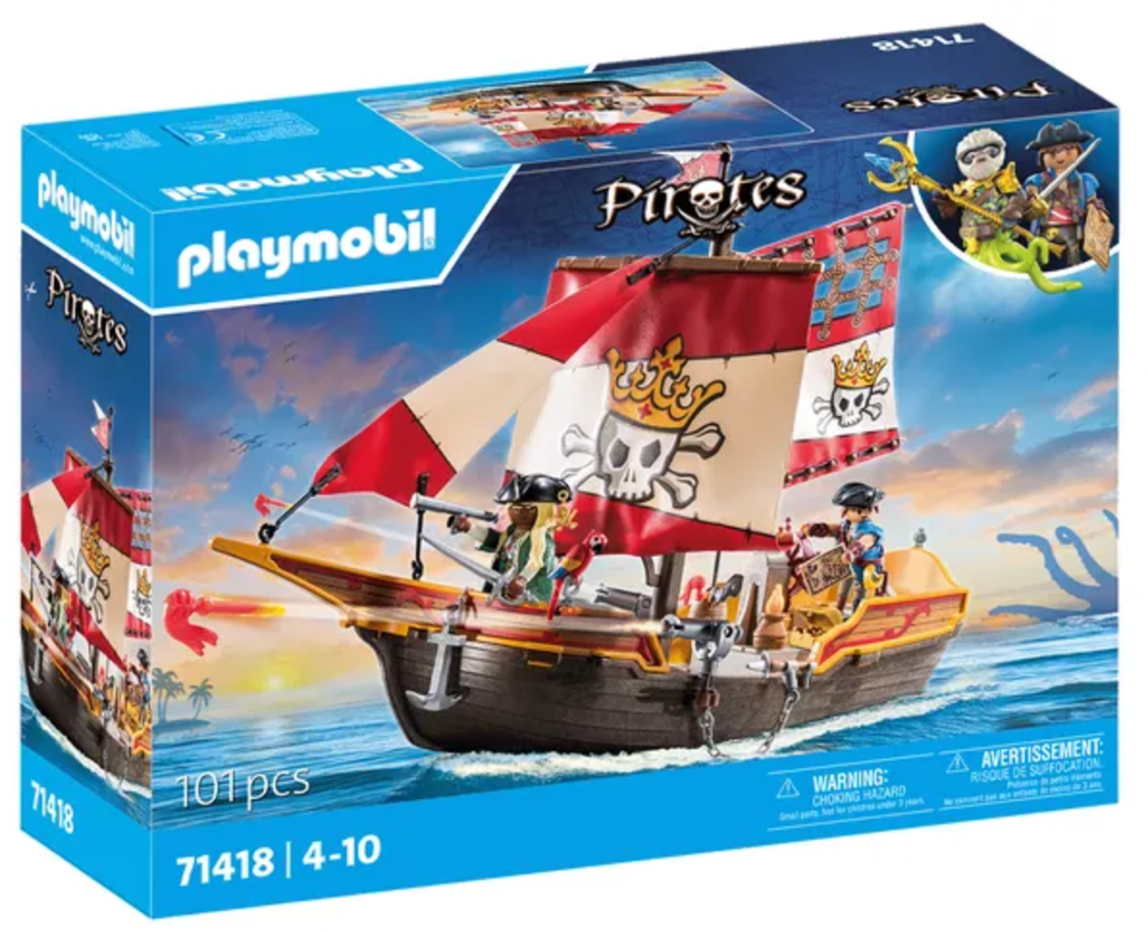- Comprend un bateau de pirate avec des voiles mobiles, des canons mobiles et inclinables offrant une puissance de feu impressionnante, deux personnages, un perroquet, une ancre solide, des harpons détachables, un trésor caché renfermant des pièces d'or, une carte au trésor énigmatique ainsi que des accessoires.