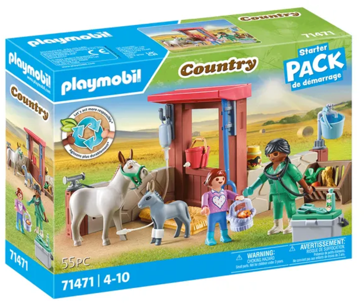 - Ce set comprend deux personnages (vétérinaire, enfant), un âne et son poulain, un abri pour soigner les animaux, un équipement médical et des accessoires..