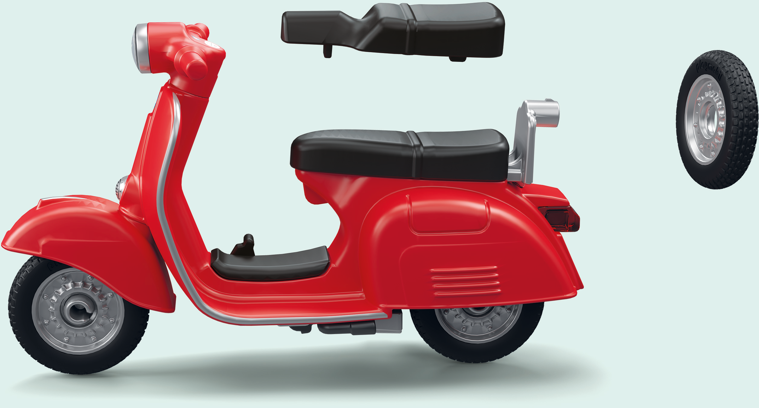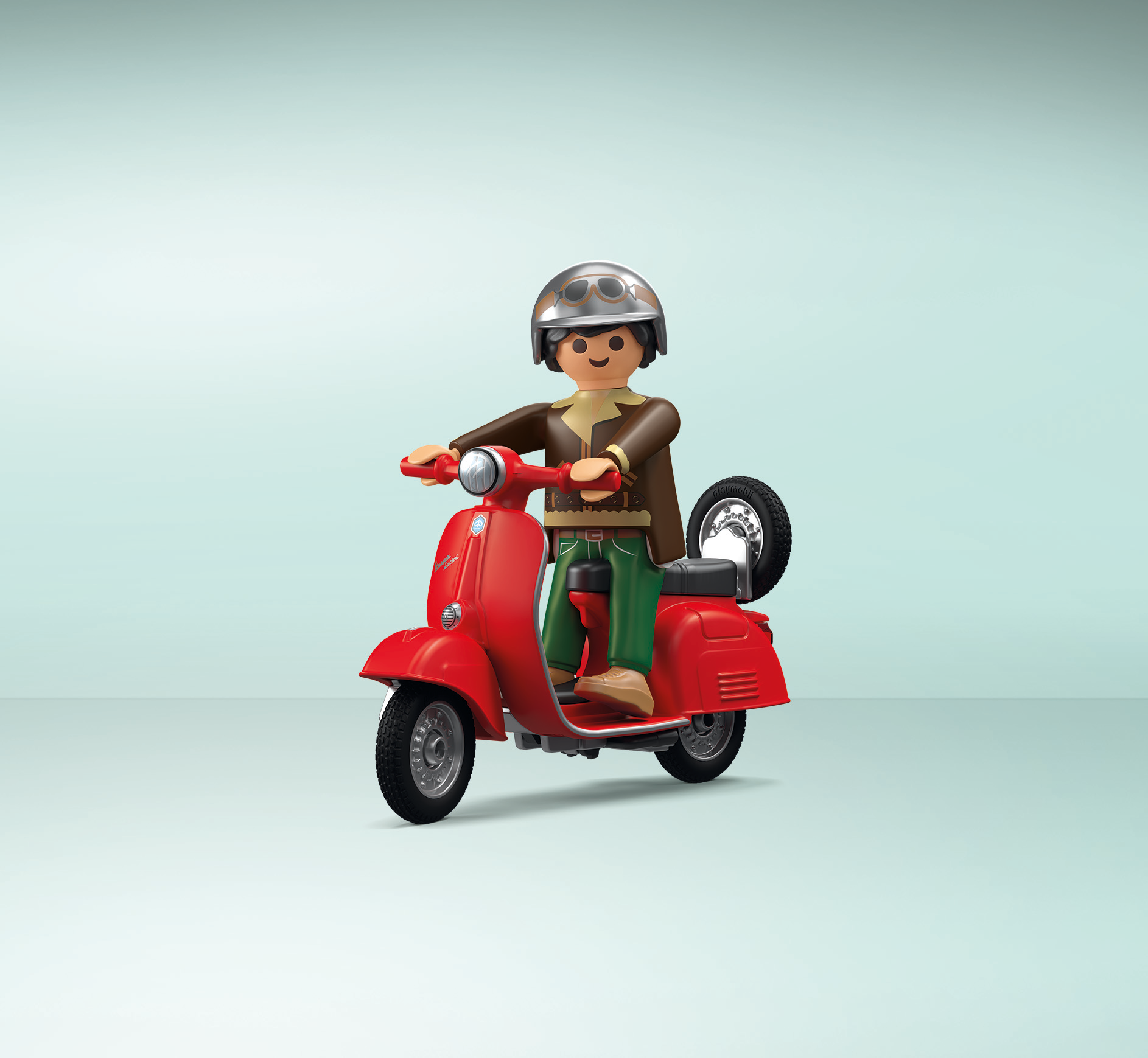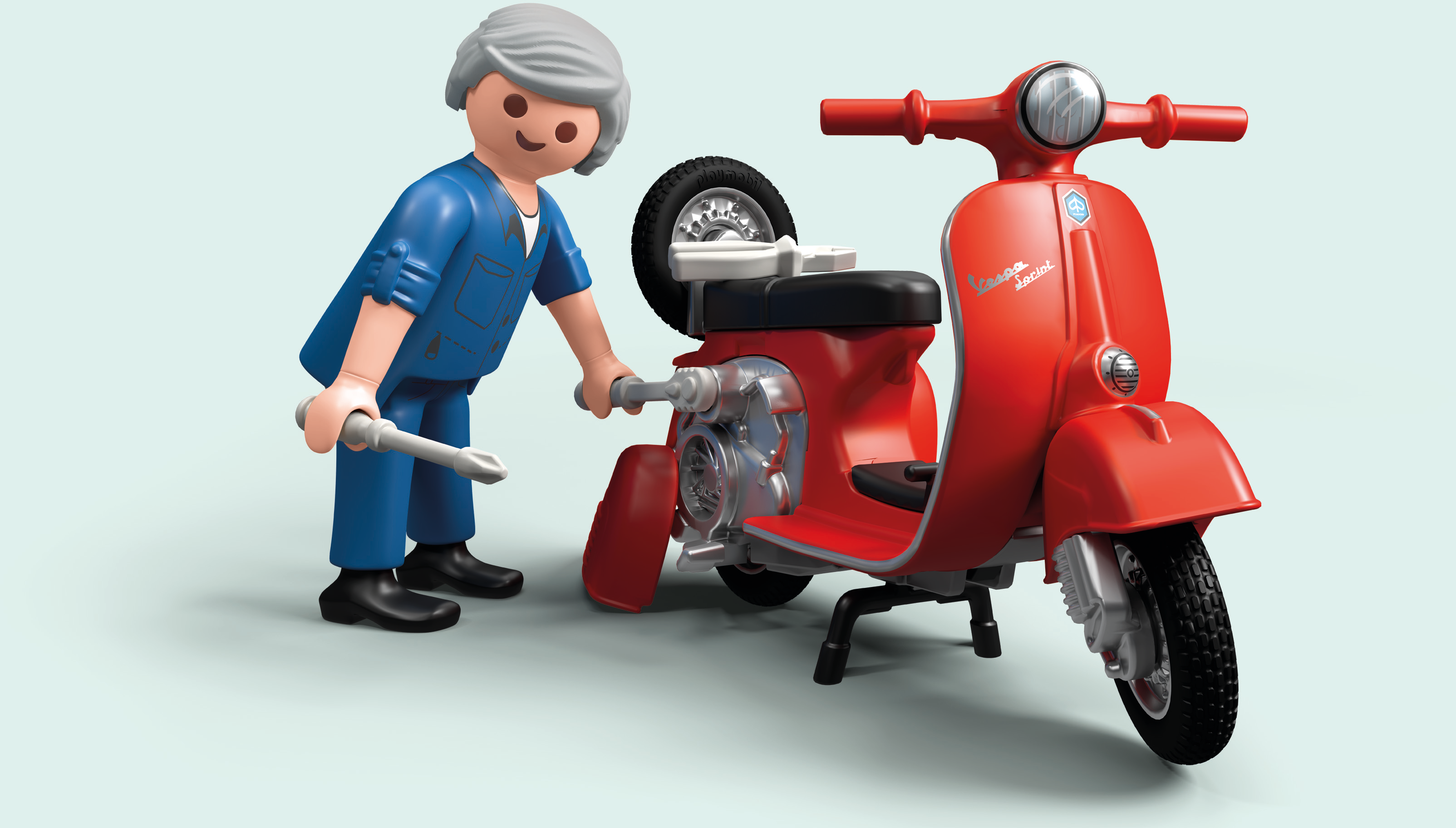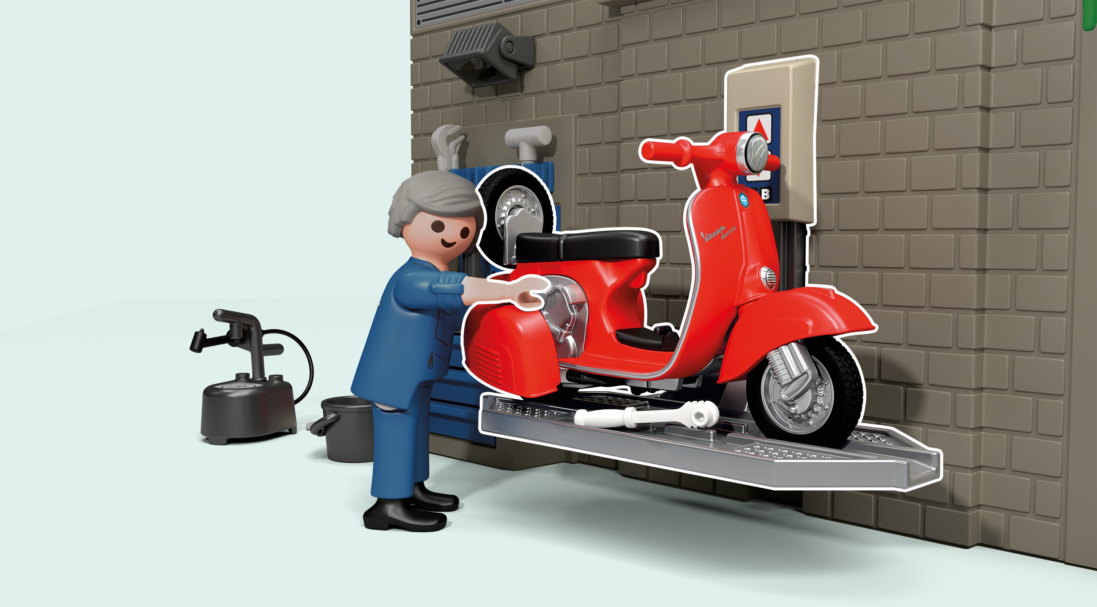 - Accessoires : 1 Vespa (roues peuvent être retirées), 1 mur de garage en 2 parties, 1 plate-forme élévatrice (mobile et offre de l'espace pour une Vespa), 1 pompe à mélange 2 temps, 1 compresseur avec pistolet, 1 bidon d'huile, 1 perceuse verticale, 1 manomètre, 1 boîte à outils, 1 balai, 1 pelle à poussière, 1 petit balai, 1 serpillière, 1 seau, 1 bidon d'huile, 1 entonnoir, 2 roues de rechange, 2 selles Vespa beige, 2 selles Vespa noires, 2 bouteilles d'huile, 1 drapeau décoratif, 1 affiche publicitaire, 1 casque.
