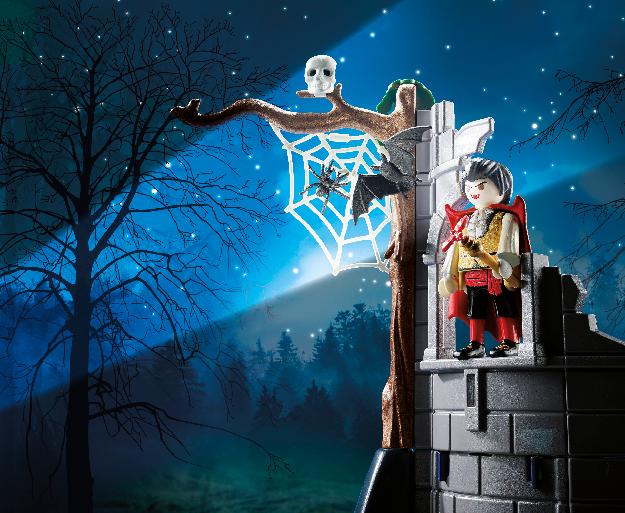 - Accessoires : 1 chapeau, 1 tablier, 1 cape, 1 parchemin, 1 bâton avec attache pour une chauve-souris, 8 parties de mur, 2 fenêtres avec toile d'araignée, 1 échelle, 1 arbre, 3 plantes suspendues, 1 toile d'araignée, 1 crâne, 1 bougie, 1 torche, 1 trône, 1 coffre au trésor, 2 os, 1 chaîne avec crochet, 1 planche à découper, 1 morceau de fromage, 3 champignons, 2 gousses d'aïl, 1 table, 1 tabouret, 2 verres de laboratoire, 1 verre à distiller avec support, 1 lampe à huile, 1 plume avec support, 1 livre, 1 couteau, 3 cristaux, 1 cercueil, 1 bouclier, 1 gargouille