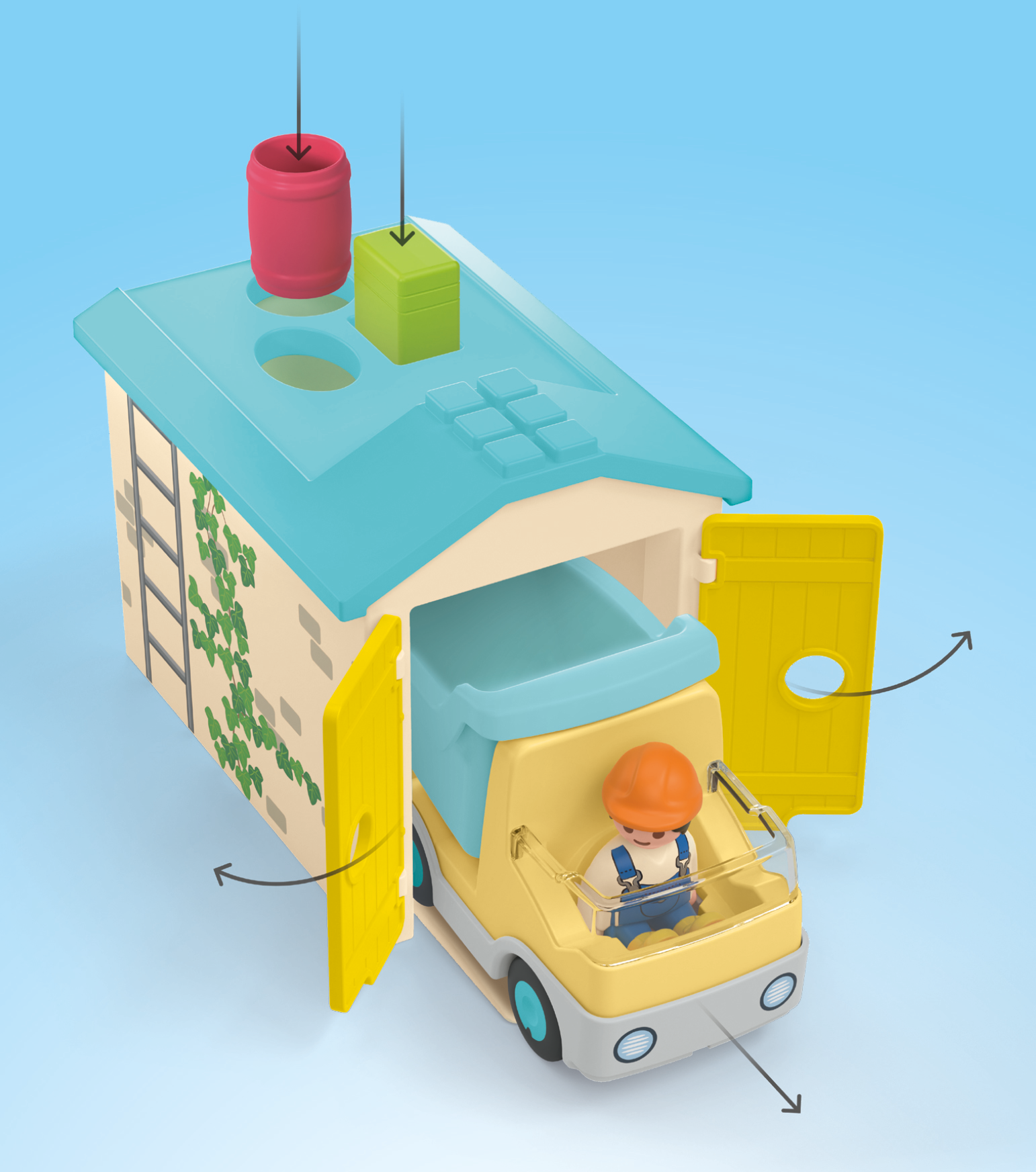 • Accessoires : 1 garage avec plateforme de tri sur le toit, 1 camion de chantier avec attelage de remorque et benne basculante mobile, 1 tonneau, 1 boîte, 1 sac
