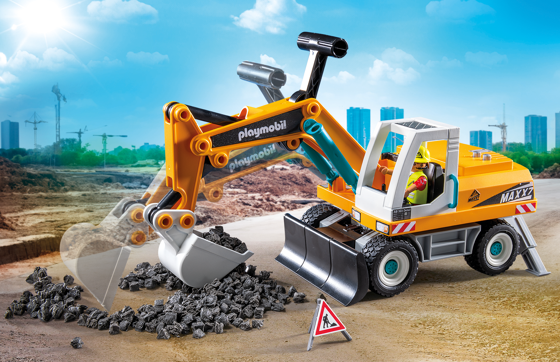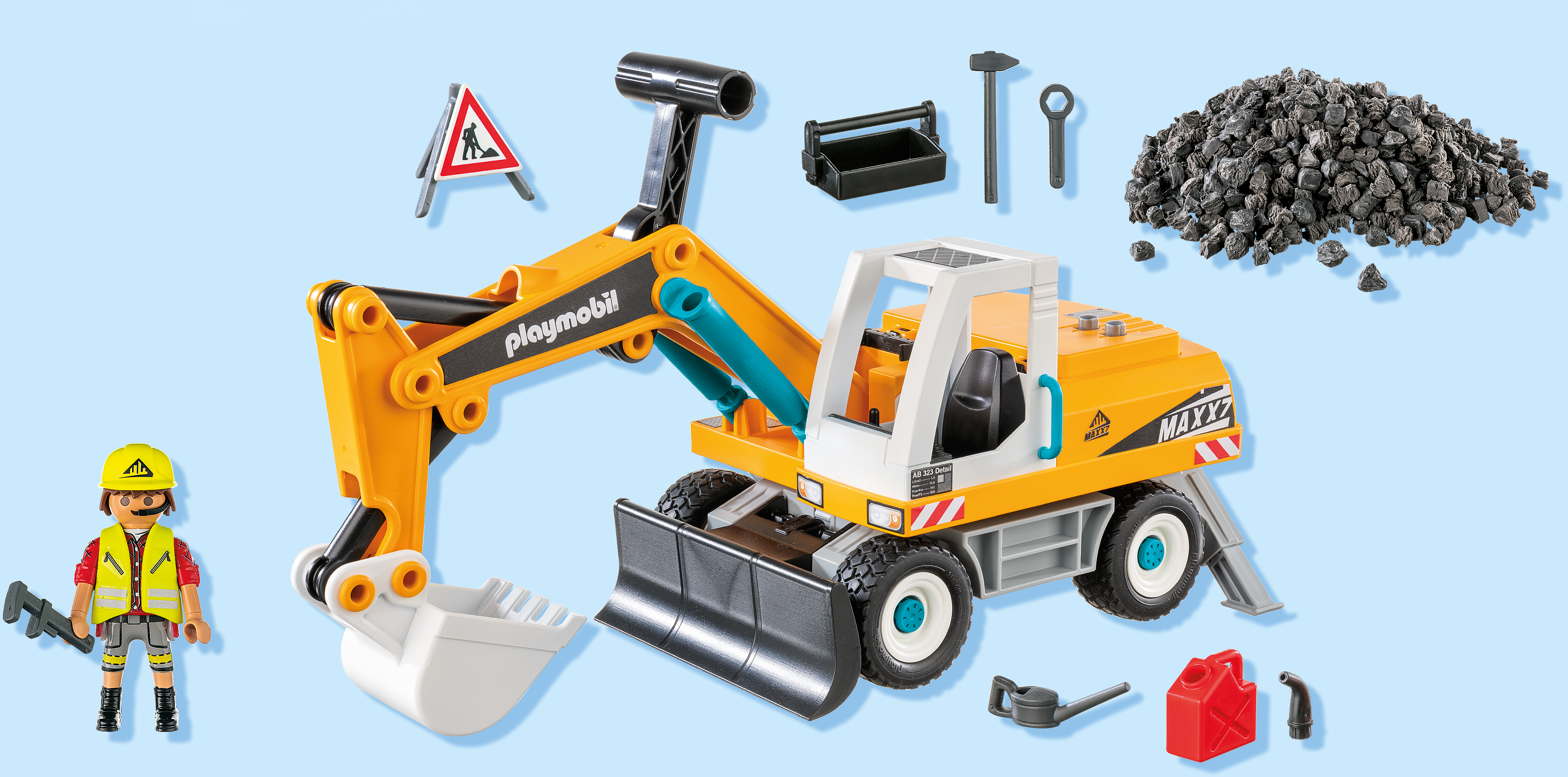 - Accessoires : 1 pelleteuse avec cabine de conduite, grande pelle, jambes de support et pelle, 1 bidon d'essence, 1 matériau en vrac, 1 équipement de chantier, 1 gilet de sécurité