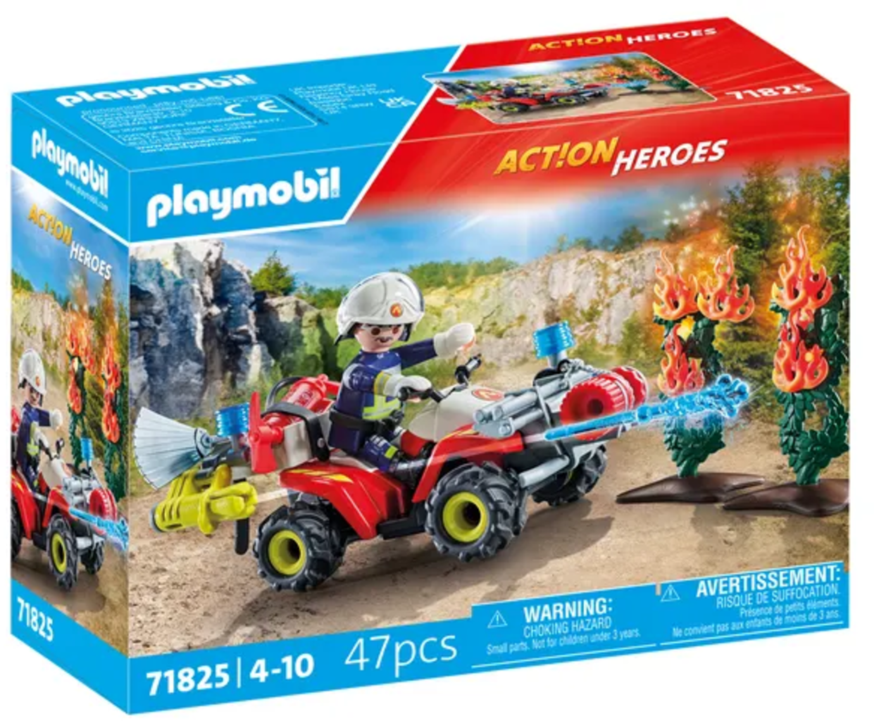 - Accessoires : 1 quad avec treuil à câble et crochet, 2 ceintures, 1 canon avec 2 flèches à eau, 1 extincteur, 2 haches, 2 petites lumières bleues, 2 buissons avec 2 plaques de base, 4 flammes, 1 batte à feu