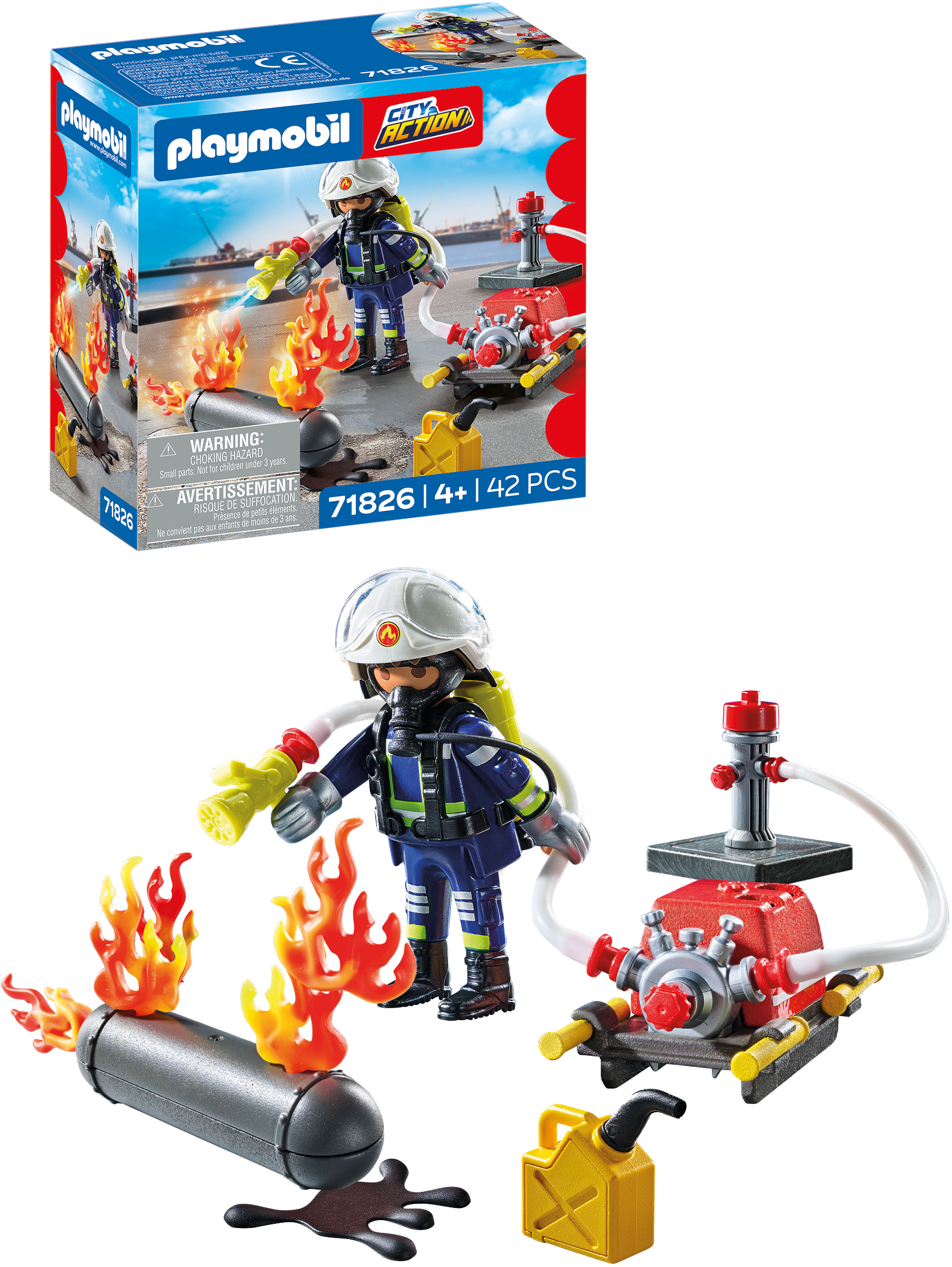 - Accessoires : 1 réservoir de gaz, 4 flammes, 1 flaque d'essence, 1 base transparente pour la flamme, 2 tuyaux d'eau, 1 attache pour tuyau d'eau, 1 pompe à eau, 1 bidon d'essence, 1 bouche d'incendie
