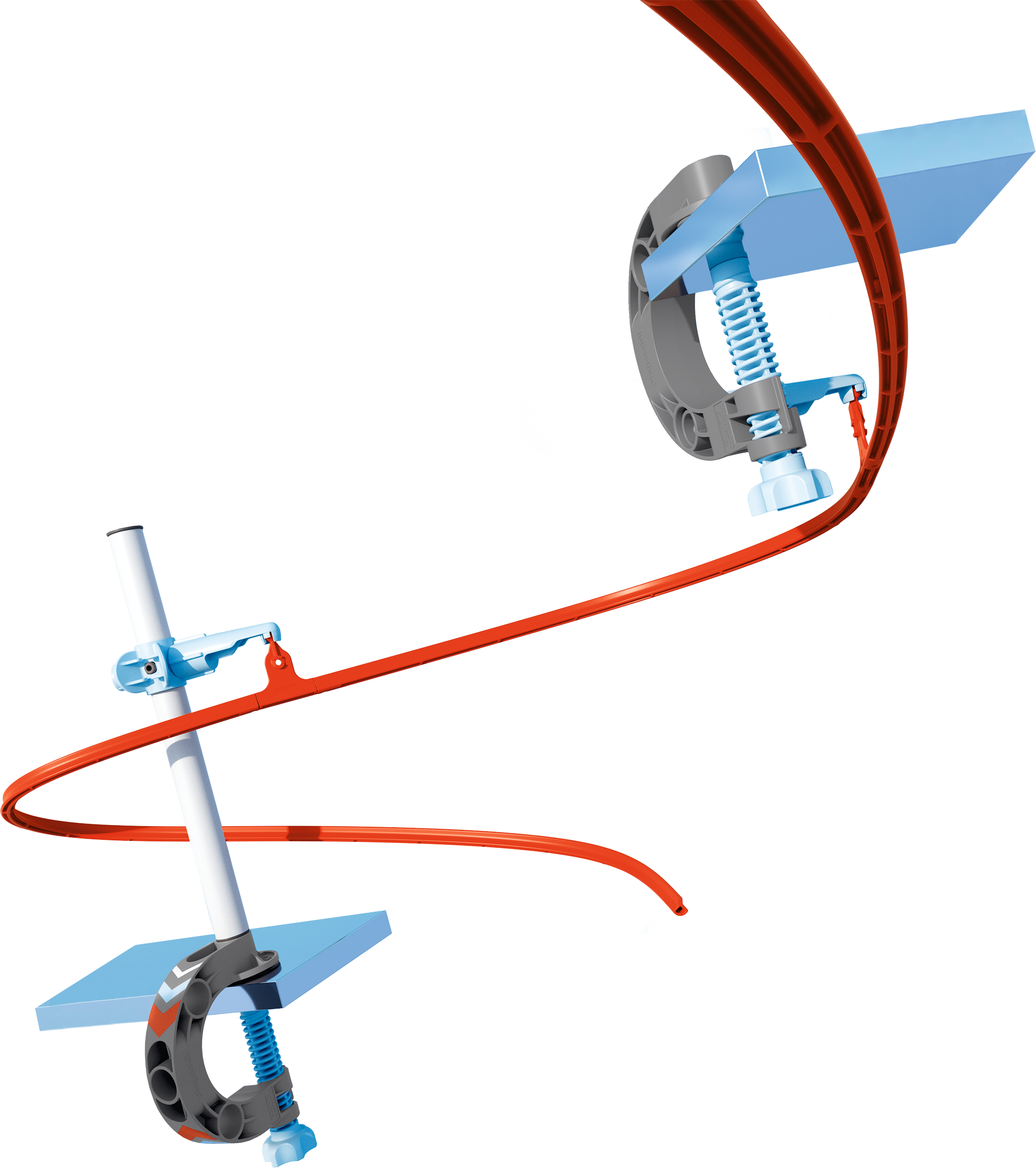- Utilisez les pinces pour attacher les rails à des étagères, un bureau ou toute autre surface stable de 7 à 65 mm d'épaisseur, afin de relier des hauteurs différentes et créer des parcours uniques à travers la chambe.