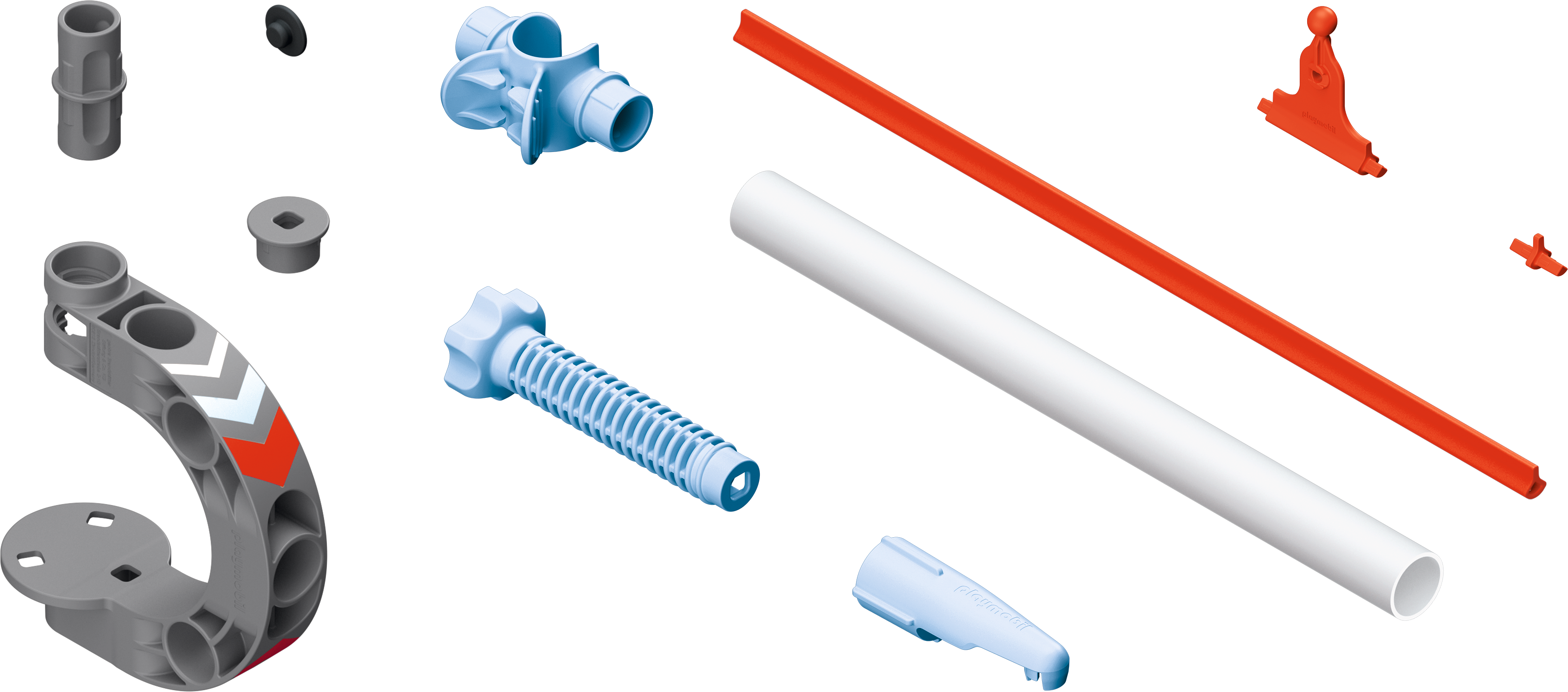 - Accessoires : 1 tube, 4 raccords de tubes, 2 capuchons de tubes, 1 pince, 2 adaptateurs, 2 rails adaptateurs avec joint à rotule, 5 rails, 4 raccords de rails, 2 serre-joints