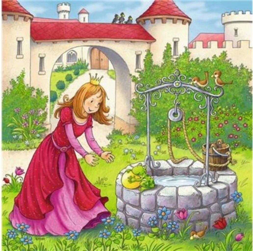 Le Petit Chaperon Rouge est en chemin pour aller voir sa grand-mère. Raiponce laisse tomber ses longs cheveux. Le Roi Grenouille sauve la boule d'or de la princesse. Trois scènes de contes de fées célèbres peuvent être reconstituées ici.