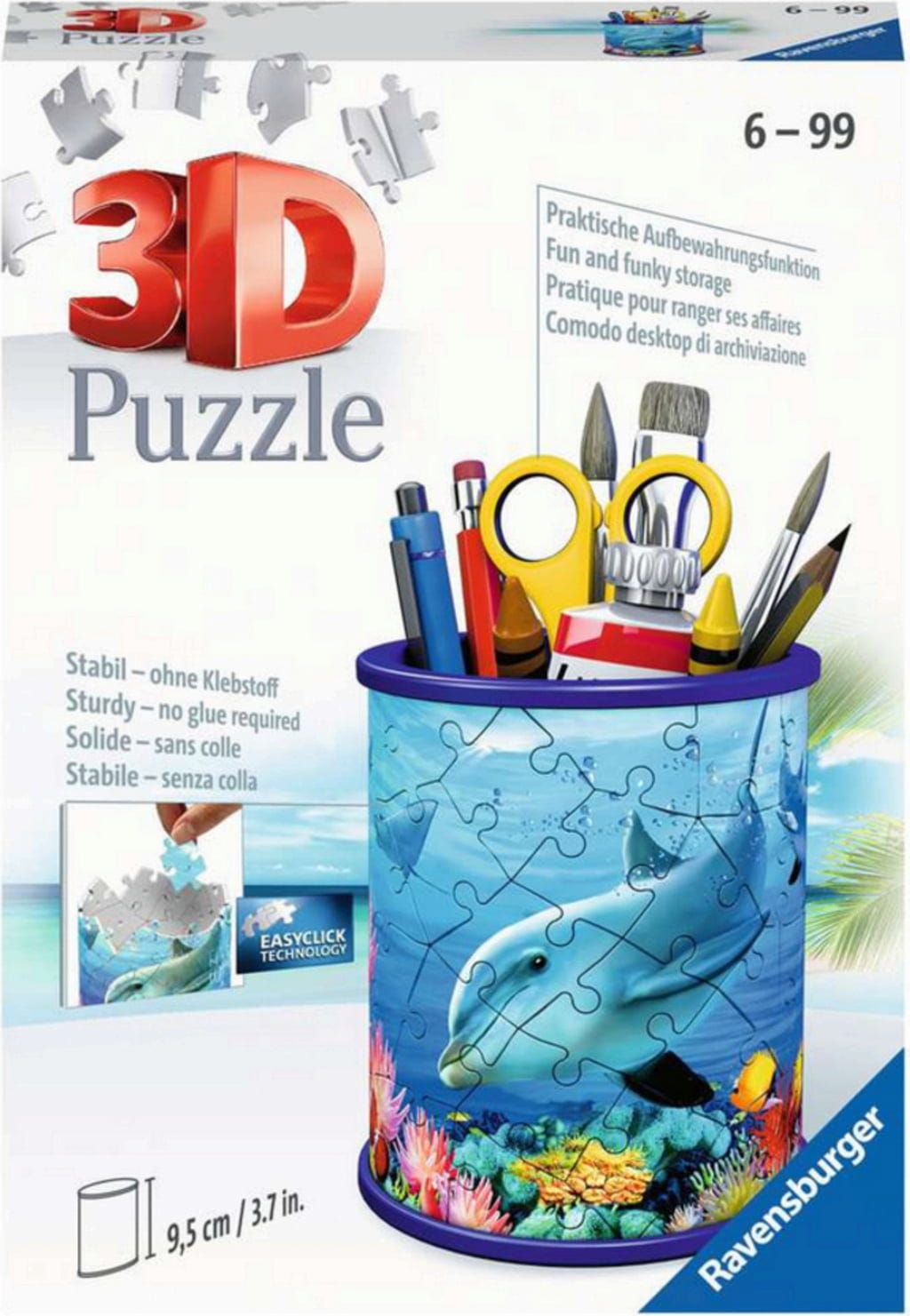 Avec un peu d'habileté, ce puzzle 3D unique se transforme en une magnifique boîte de rangement, idéale pour ranger stylos, bijoux ou autres petits objets. Les pièces de puzzle robustes en plastique s'assemblent facilement grâce à la technologie Easyclick et tiennent sans colle.