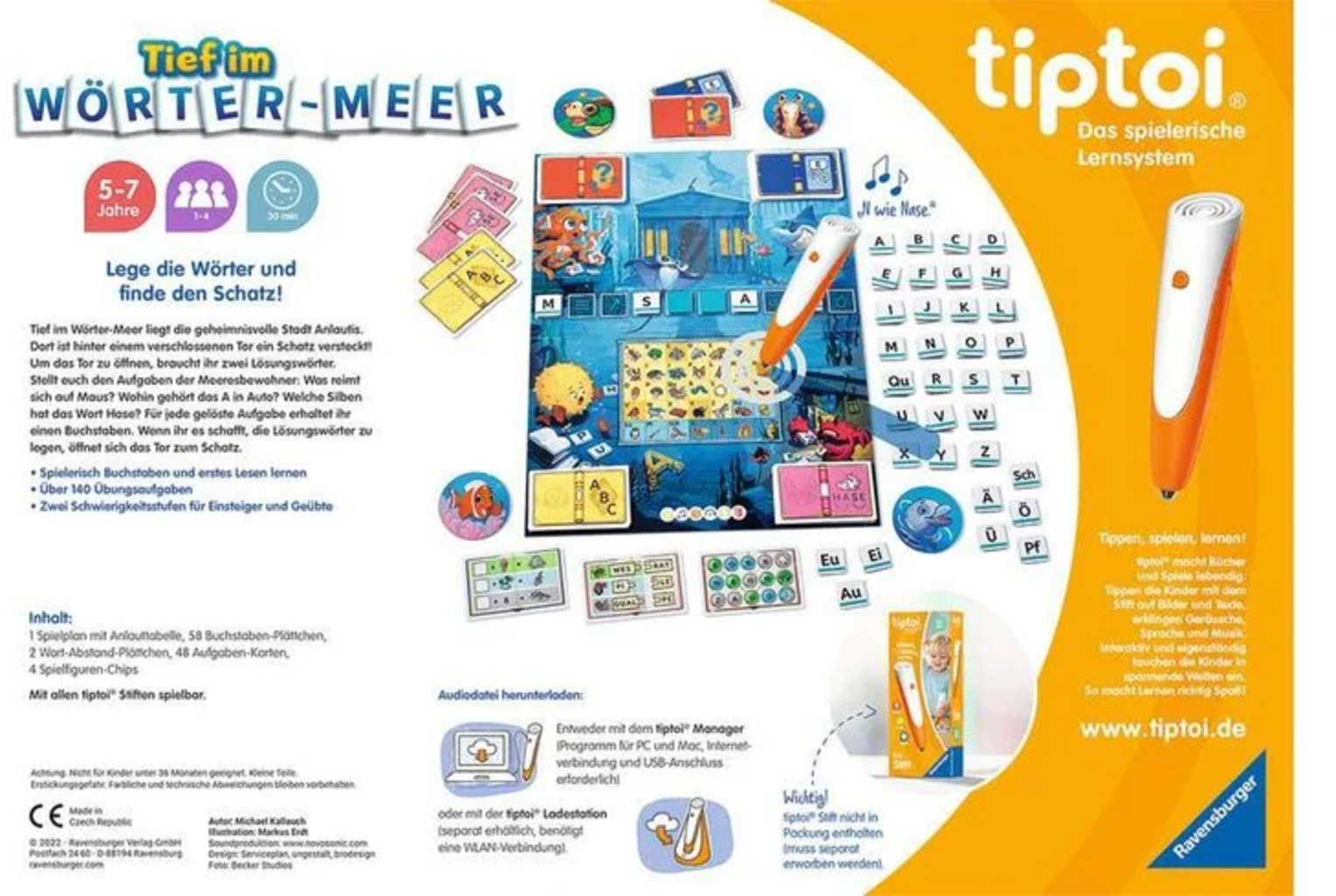 Contenu : 1 plateau de jeu avec tableau des sons initiaux, 58 tuiles lettres, 2 tuiles espace-mots, 48 cartes de tâches, 4 jetons de personnages, 1 mode d'emploi. Stylo tiptoi non inclus. Doit être acheté séparément