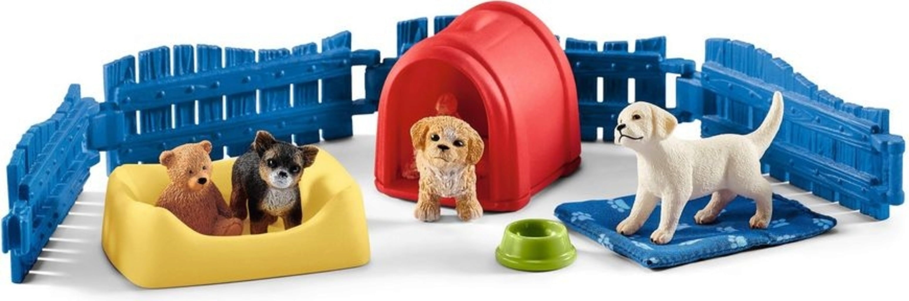 Contenu: 1x chiot maltipoo, 1x chiot chihuahua, 1x chiot labrador retriever, 1x niche pour chien, 1x panier à chien , 1x couverture, 1x gamelle, 1x ours en peluche, 5x clôture