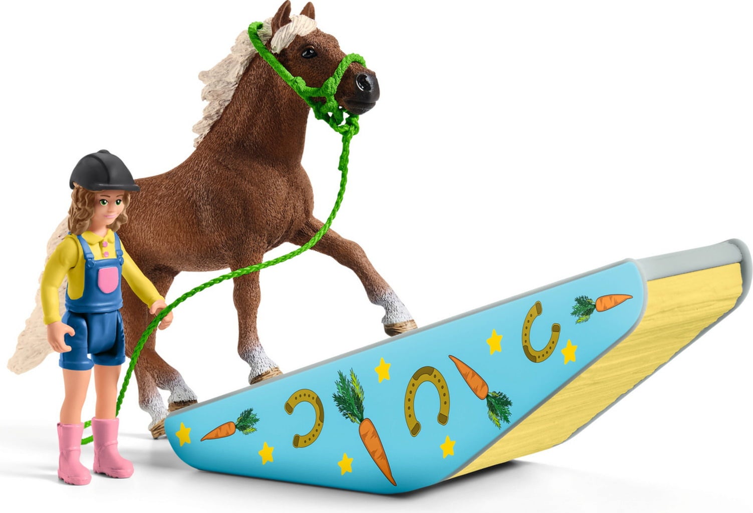 Contenu: 1x poney classique, 1x poney shetland, 1x jeune fille, 1x bombe, 1x harnais, 1x longe, 1x porte d’accès, 8x paddock, 1x bascule, 4x cône, 4x obstacle souche d’arbre, 2x barre, 2x ballon, 1x socle, 1x porte voûtée, 4x fanion, 1x barre transversale, 5x rideau, 1x feuille d’autocollants
