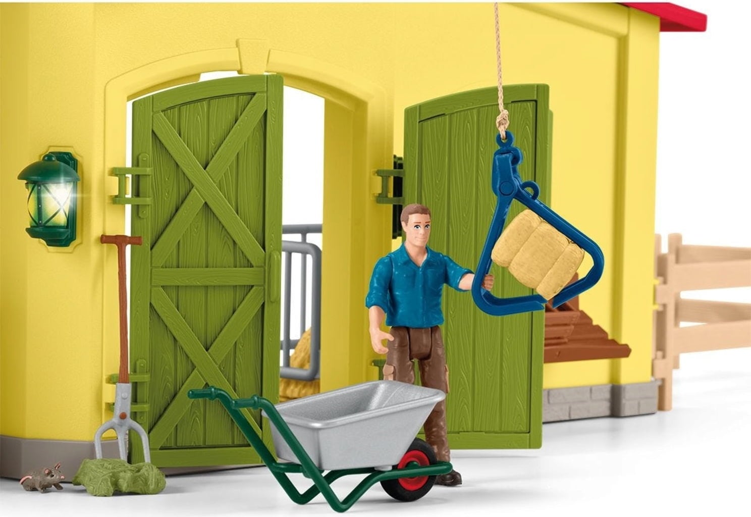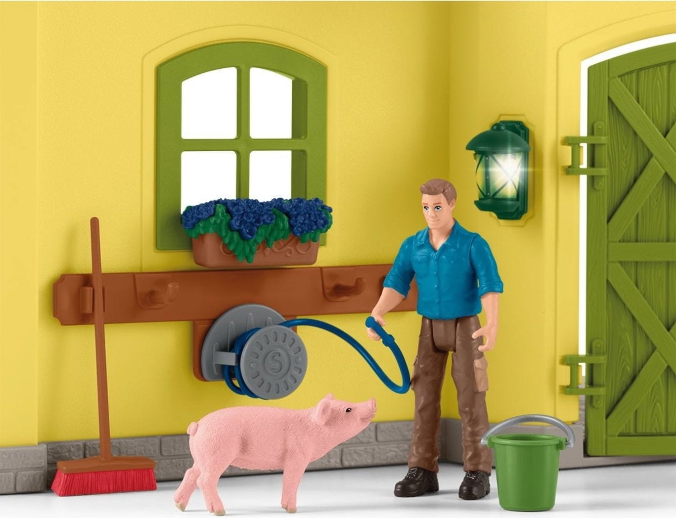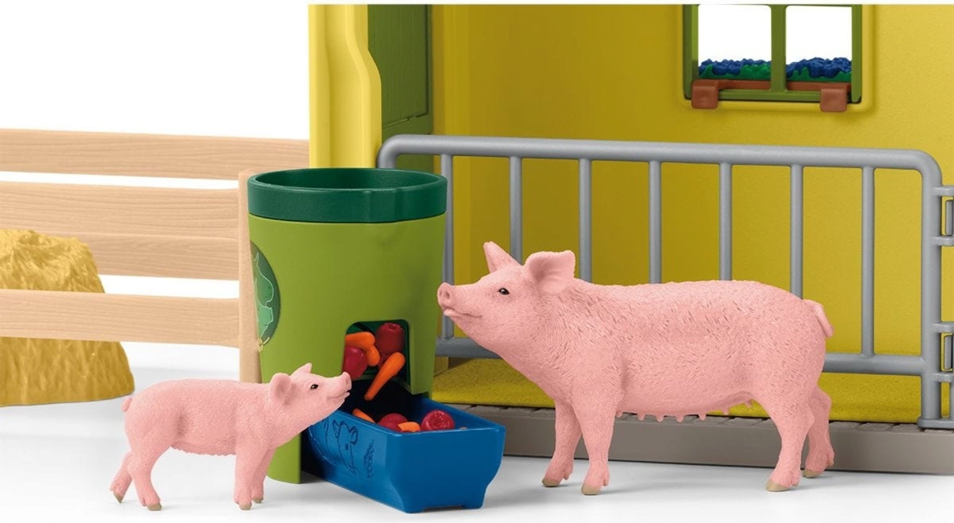 Contenu :1 étable, 1 fermier Paul, 1 vache, 1 veau, 1 cochon, 1 porcelet, 1 chat, 1 pigeon, 1 souris, 1 pigeonnier, 2 bacs à fleurs, 2 pièces de paille, 4 clôtures longues, 2 clôtures courtes, 1 grue avec treuil, 1 distributeur de nourriture, 1 grotte de foin, 1 tuyau d’eau, 1 échelle, 1 caisse de nourriture, 1 râtelier, 1 écuelle, 1 biberon, 1 brosse pour vache, 1 mangeoire, 1 fourche à foin, 1 foin à enfourcher, 1 balai, 1 brouette, 1 seau, 1 ballot de paille, 1 ballot de foin, 8 carottes, 6 pommes, 1 lot d’œufs, 1 planche d’autocollants