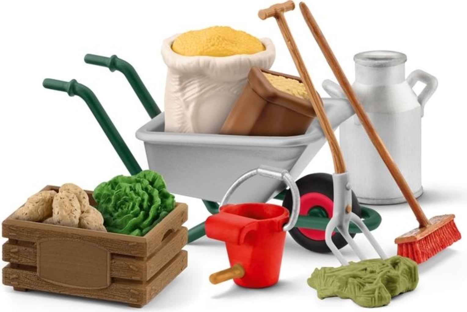 Contenu :1 brouette, 1 sac d'avoine, 1 sac de friandises, 1 tas de foin à fourcher, 1 fourche, 1 balai, 1 lot de pommes de terre, 1 salade, 1 bidon de lait, 1 boîte d’aliments, 1 seau pour veau