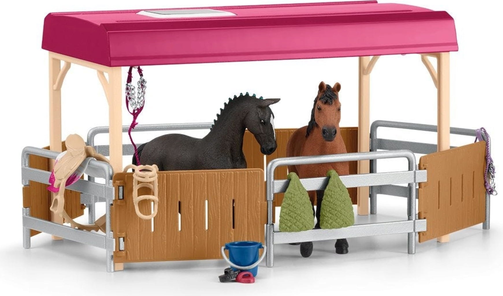 Contenu:1 van, 4 sièges de voiture, 1 pièce de paille, 1 table, 2 chaises, 1 kitchenette, 1 échelle, 4 clôtures, 4 panneaux de bois pour clôture, 1 strapontin pour box pour chevaux, 2 rideaux, 2 inserts en bois, 1 sac à dos, 1 barbecue, 6 guêtres de transport, 1 pince à barbecue, 1 ballon de plage, 3 saucisses, 2 épis de maïs, 1 tuyau d’arrosage avec embout, 1 balai, 1 fourche, 1 réservoir d’eau avec pompe. 2 barres d’obstacles, 2 2 porte-selles et porte-brides, 2 porte-selles, 3 harnais, 3 selles, 1 ballot de paille, 3 assiettes, 3 tasses, 1 parasol, 3 bouteilles, 1 vase, 3 filets à foin, 4 troncs d’arbre, 1 os, 2 carottes, 1 ballot de foin, 1 bouquet de fleurs, 1 étrille, 1 brosse douce, 3 bombes, 1 casque, 1 canapé, 3 chevaux, 1 Golden Retriever, 2 couvertures en tissu, 3 coussins, 3 tapis de selle, 3 licols d’écurie, 1 couverture pour cheval, 3 personnages