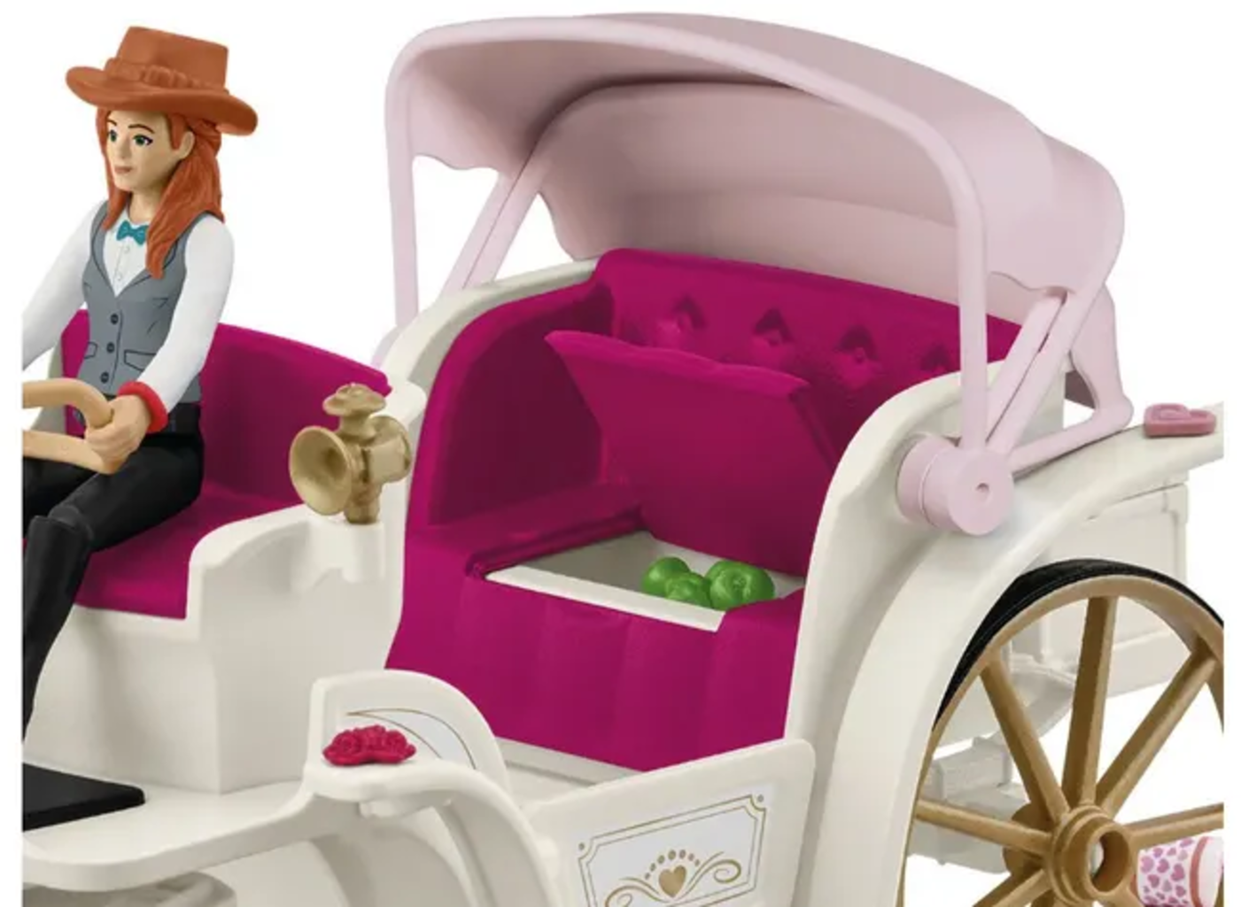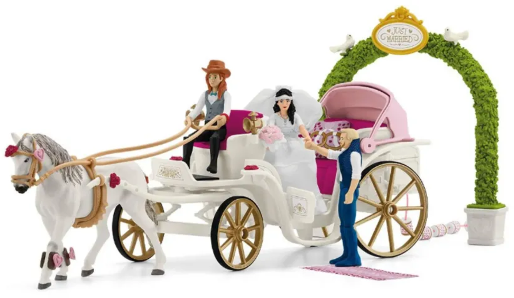 Contenu: 1 Lipizzan, 1 mariée Emily, 1 marié Toby, 1 Hannah, 1 calèche, 5 boîtes de conserve, 1 fil, 1 malle, 1 bouteille, 1 appareil photo, 1 harnais, 1 sangle, 1 robe, 1 voile, 1 gilet, 3 bijoux pour cheval, 2 guêtres, 1 pomme, 1 bouquet, 2 buissons de buis, 1 arche en buis, 1 panneau, 2 colombes, 1 coussin, 1 tapis