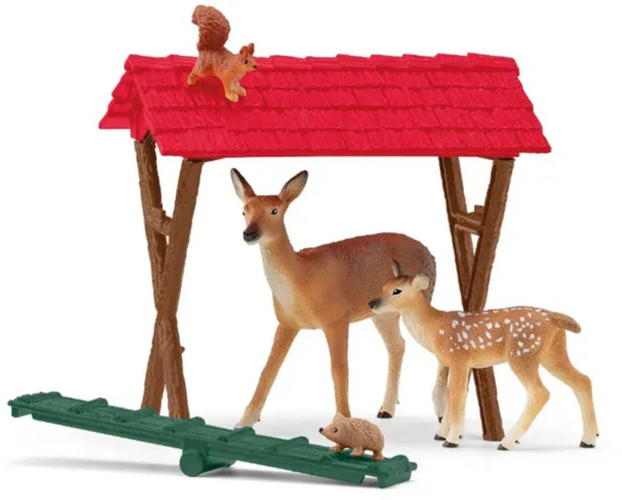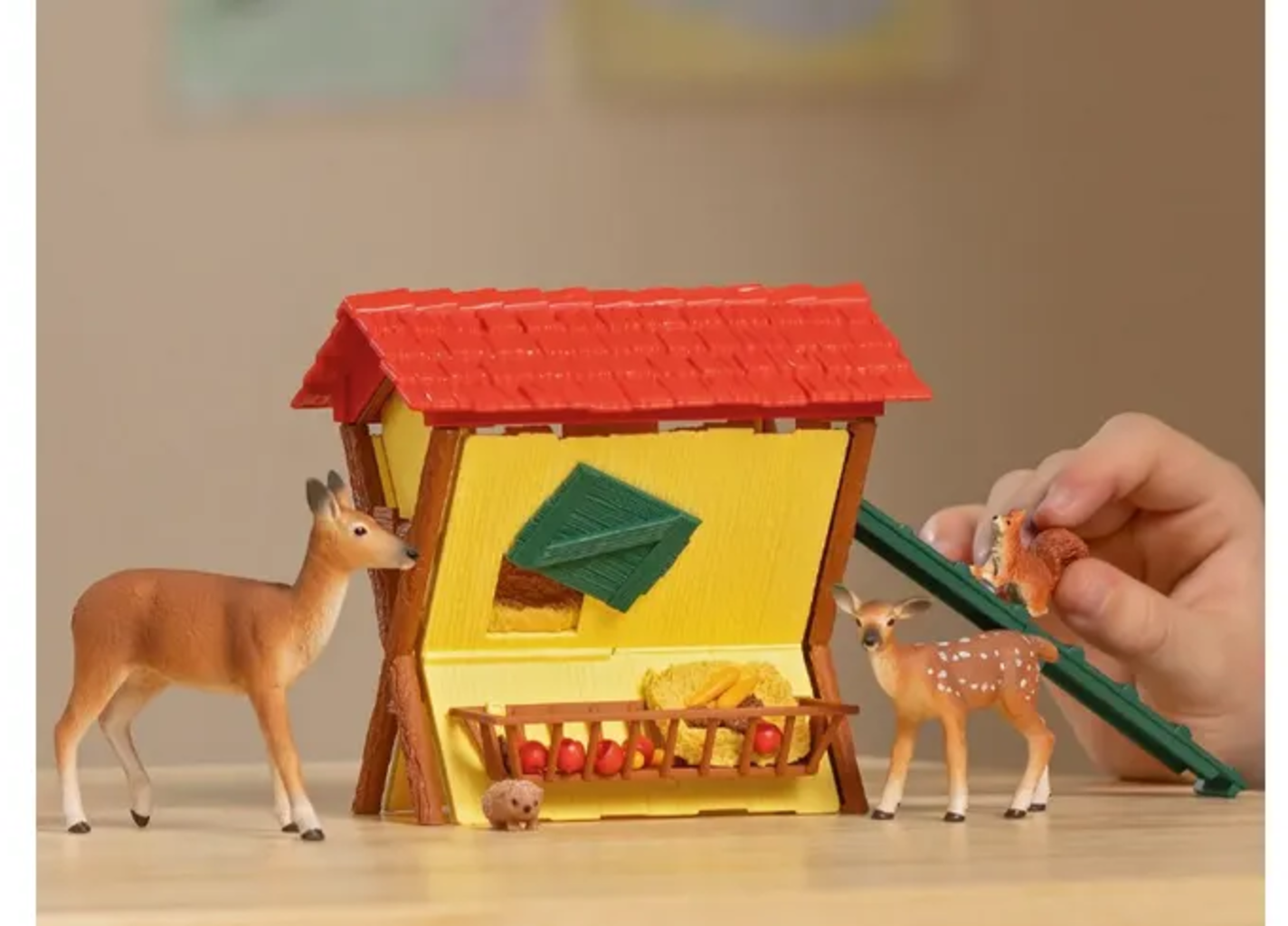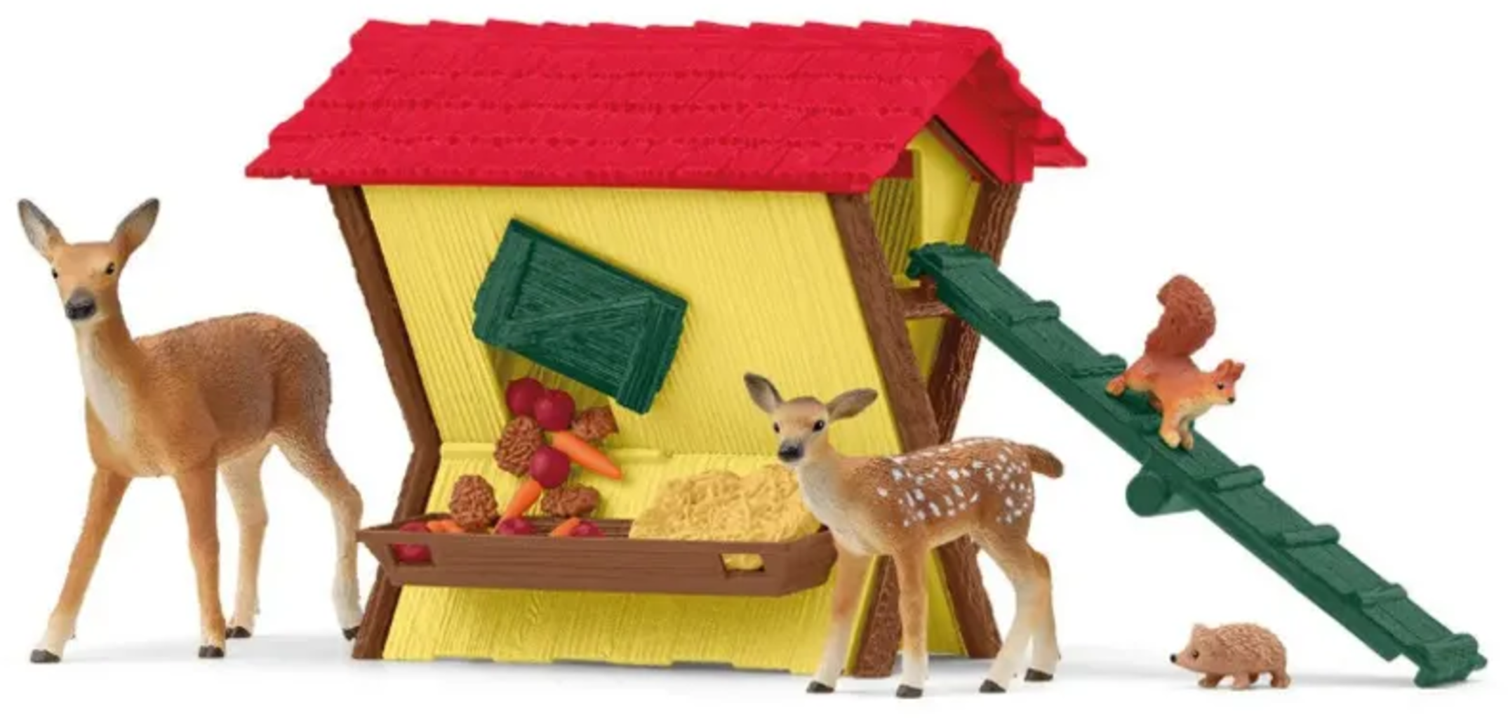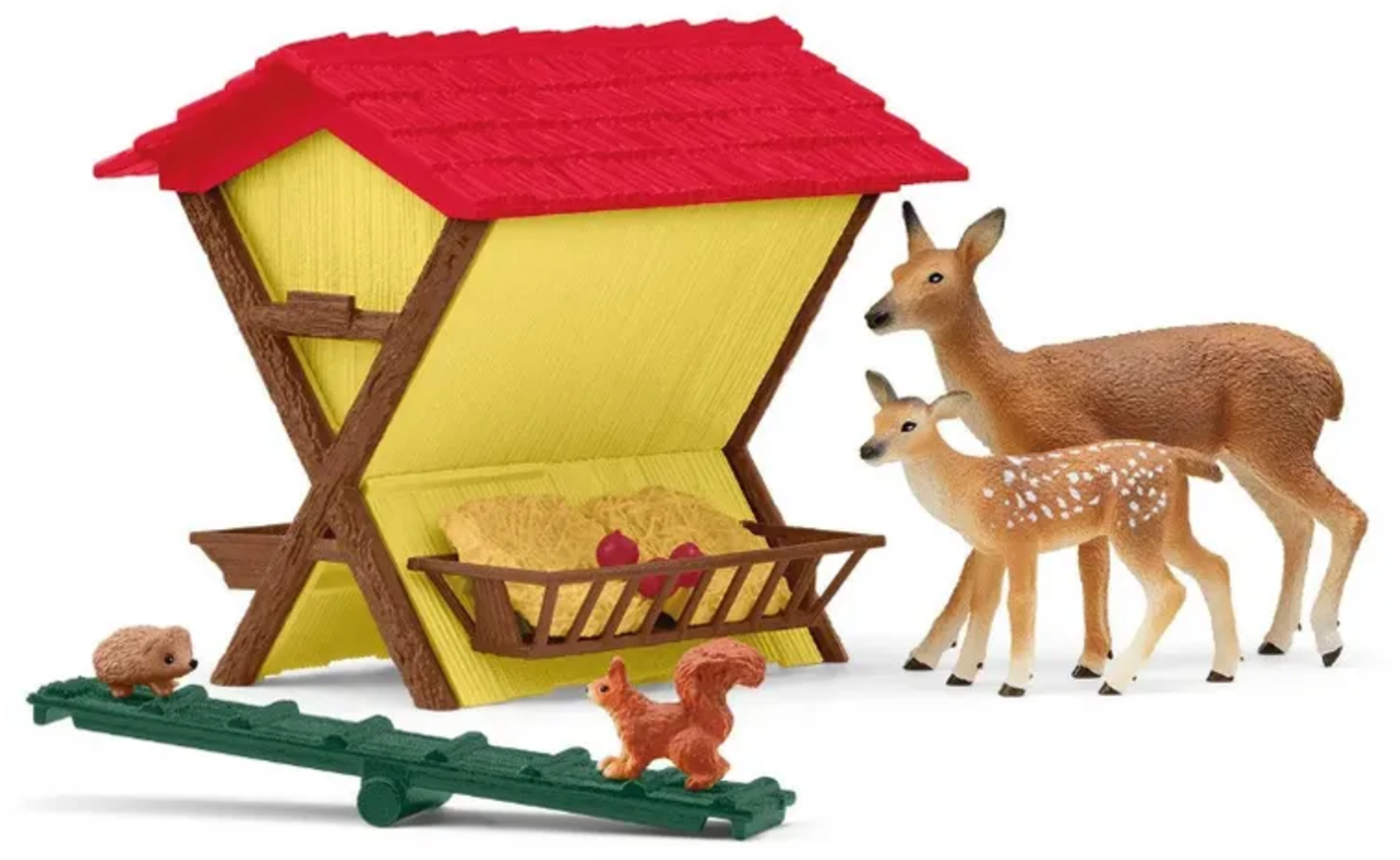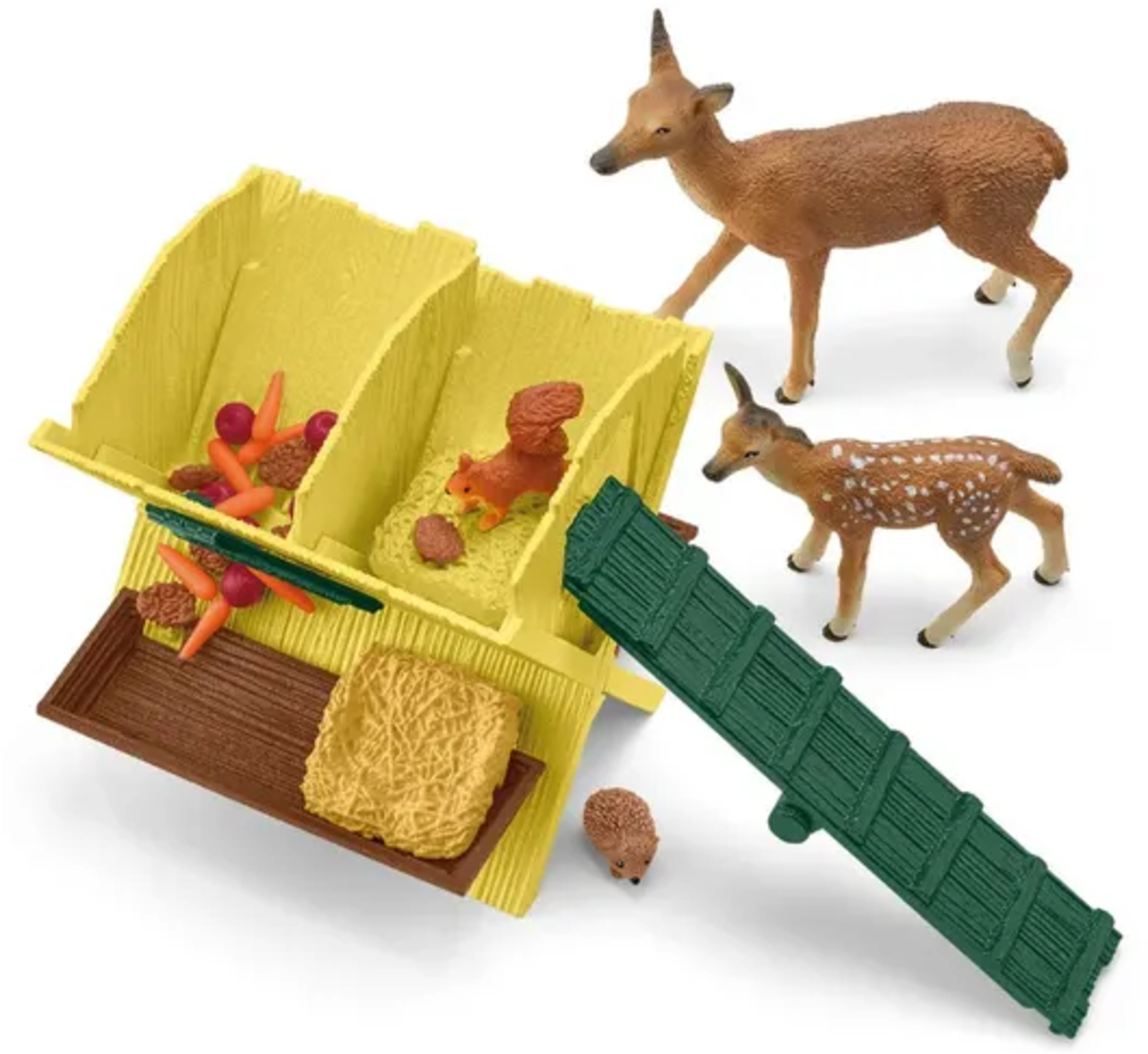 Contenu :1 cabane avec toit amovible, 1 planche avec fonction bascule, 1 auge, 1 râtelier, 1 réserve de foin, 6 portions de croquettes, 1 biche, 1 faon, 1 hérisson, 1 écureuil, 6 pommes, 8 carottes