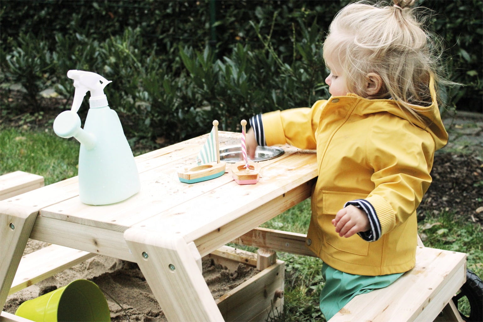 Le bac à sable peut être facilement glissé vers l’intérieur ou l’extérieur, permettant ainsi d’utiliser simultanément la zone de sable et l’espace table avec assise. La bassine en métal amovible transforme la surface de la table en un clin d’œil en une cuisine à boue, avec un emplacement prévu pour un petit parasol afin d’offrir un confort supplémentaire.