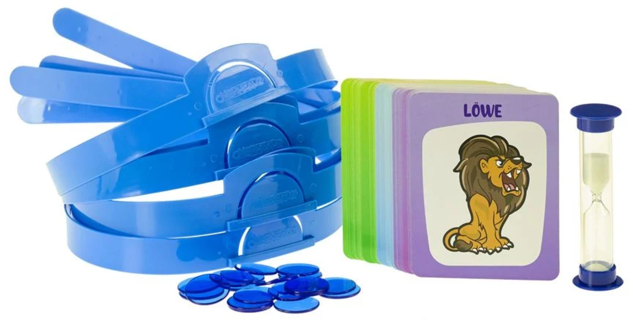 Contenu : 72 cartes illustrées en allemand, 24 jetons de jeu, 6 bandeaux réglables et 1 sablier (60 secondes).