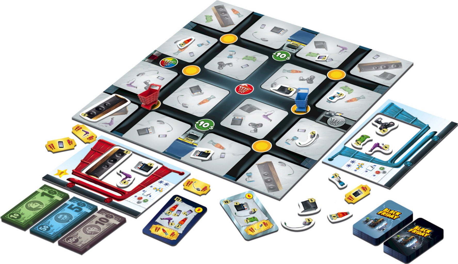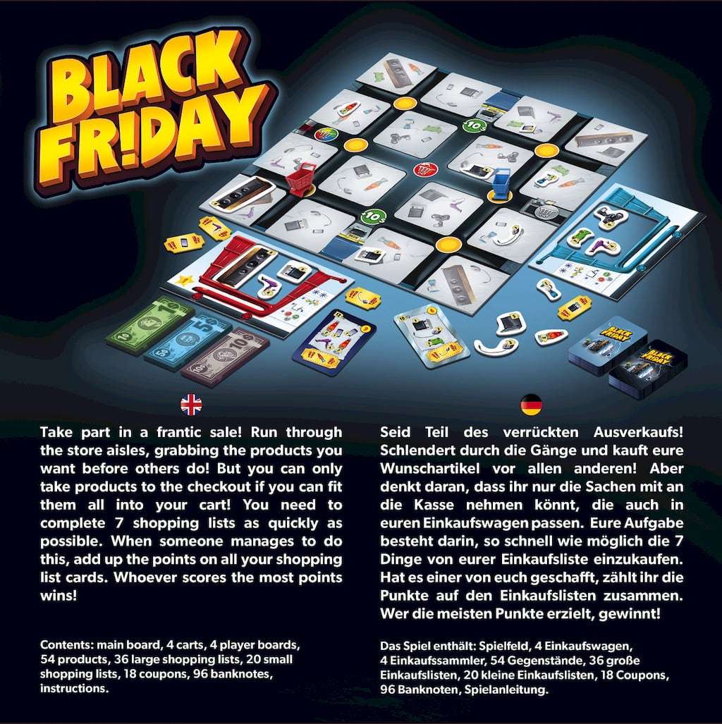 Contenu : plateau de jeu, 4 caddies, 4 collecteurs de courses, 54 objets, 36 grandes listes de courses, 20 petites listes de courses, 18 coupons, 96 billets de banque.
