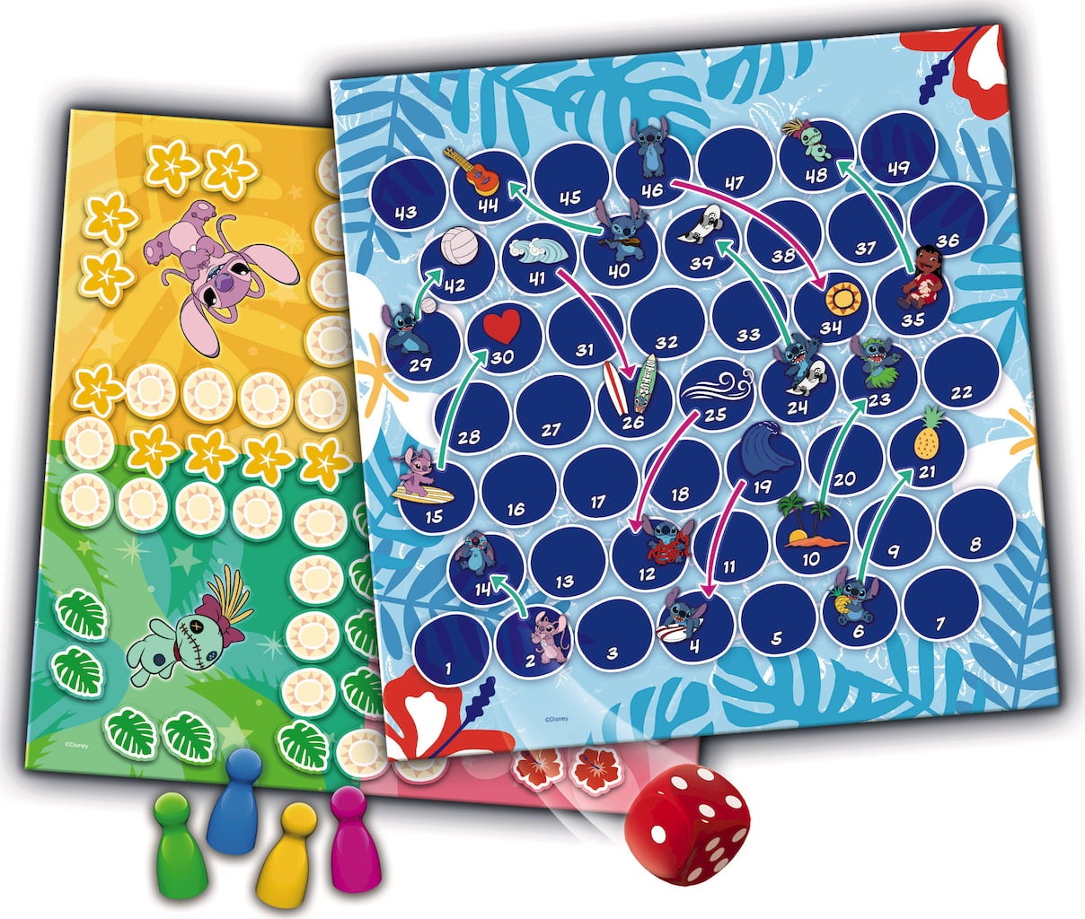 Des heures de plaisir avec Lilo & Stitch ! La boîte de jeu contient deux jeux de société classiques au design coloré : Serpents & échelles et Jeu de l'oie. Ils ont été conçus pour les enfants à partir de 4 ans et peuvent être joués jusqu'à 4 personnes. Aloha !